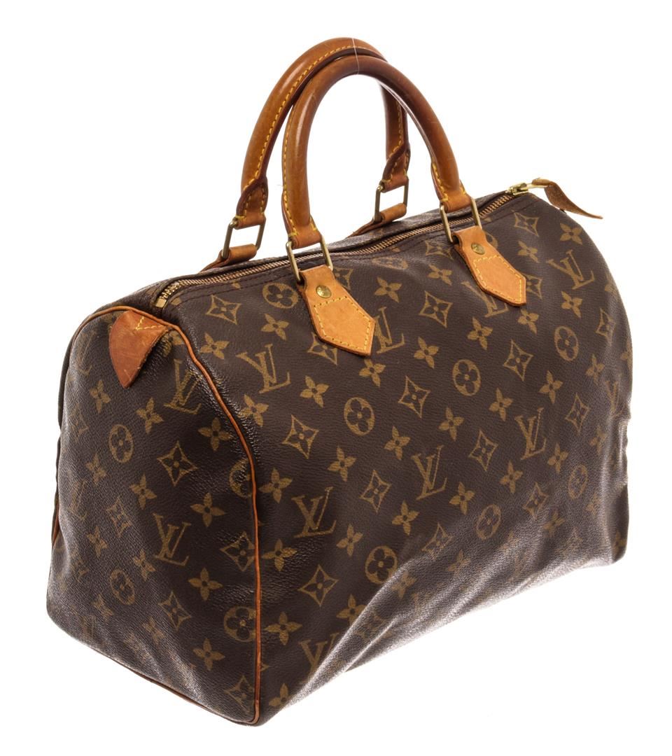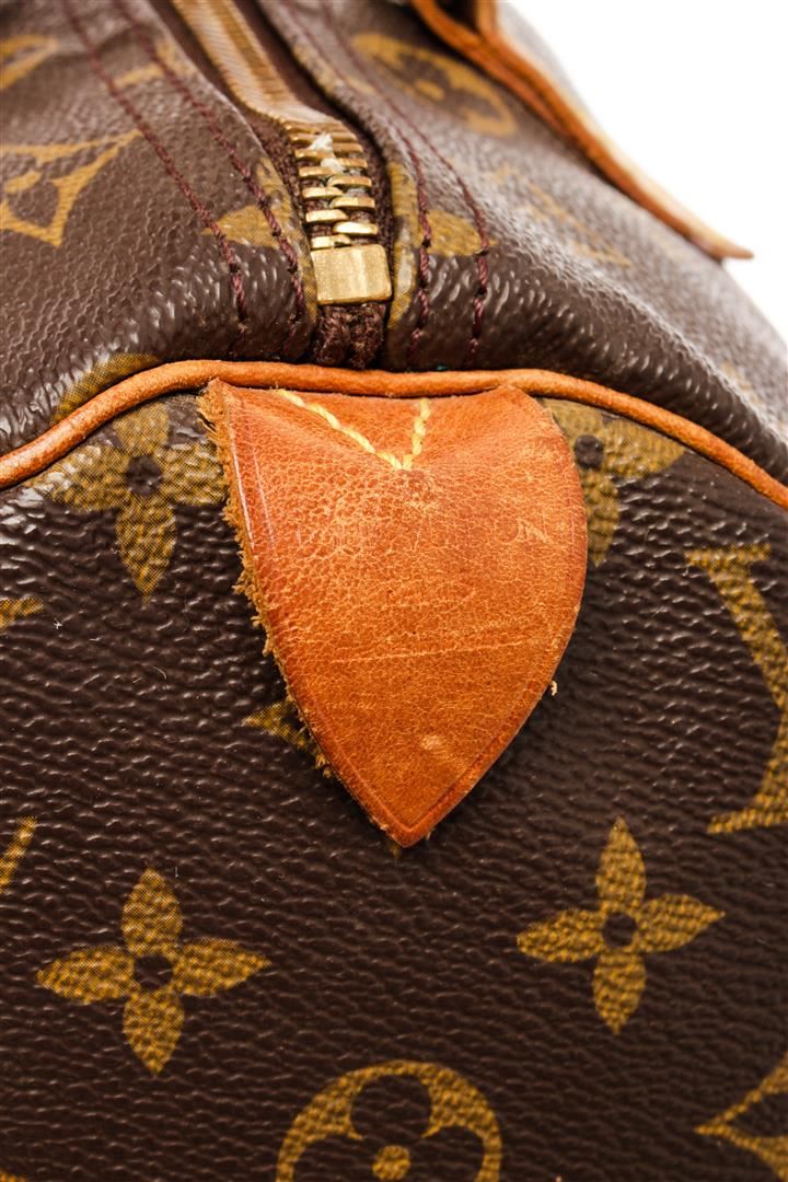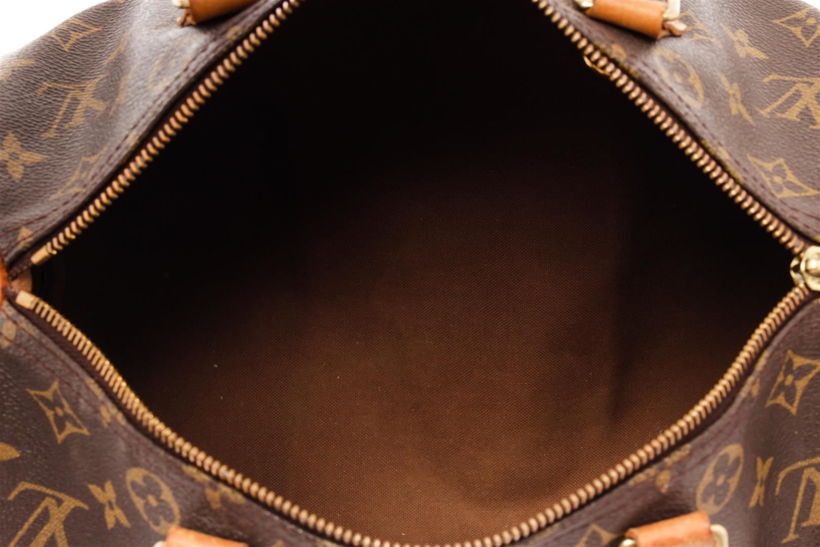 Louis Vuitton Brown Monogram Leather Speedy 30 Satchel Bag. All available information is listed in the description and shown in the photos. Louis Vuitton Brown Monogram Leather Speedy 30 Satchel Bag with brown & neutrals, brass hardware, leather trim, rolled handles, leather trim embellishment, grosgrain lining & single interior pocket, zip closure at top. Height: 8.25" Width: 11.75" Depth: 6.75", Handle Drop: 3" / 20.95 x 29.84 x 17.14 Cm