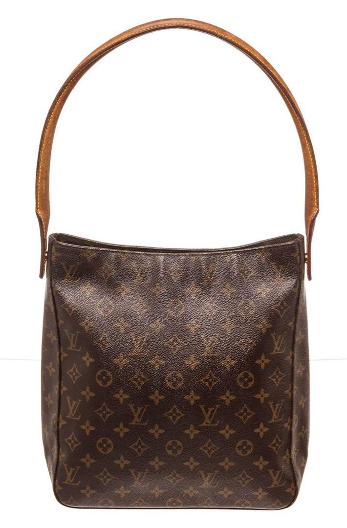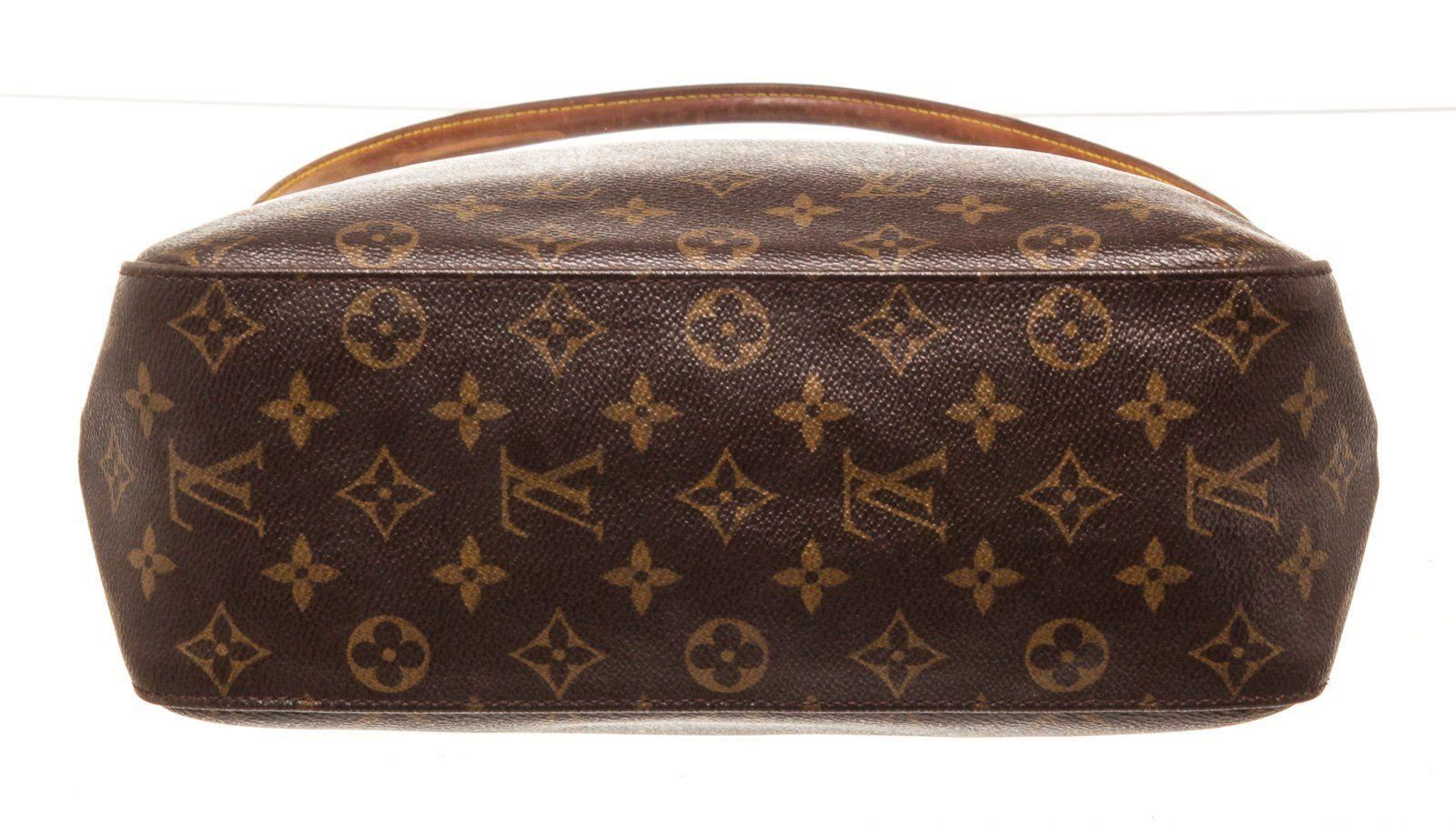 Louis Vuitton Brown Monogram Looping GM Shoulder Bag with material monogram canvas, gold-tone hardware, trim tan vachetta leather, interior zip pocket, shoulder strap and zipper closure.