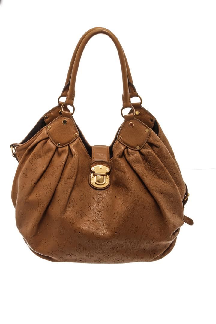 One Louis Vuitton Brown Monogram Mahina Leather Surya L Shoulder Bag. Item is sold AS-IS. All available information is listed in the description and shown in the photo. louis vuitton brown monogram mahina leather surya l shoulder bag with it features top handles and a flap with a push-lock closure that leads to an alcantara-lined interior. the bag is finished with protective metal feet and gold-tone hardware. Height: 10.24" Width: 5.91" Depth: 13.39" , Handle Drop: / 26 x 15 x 34 Cm