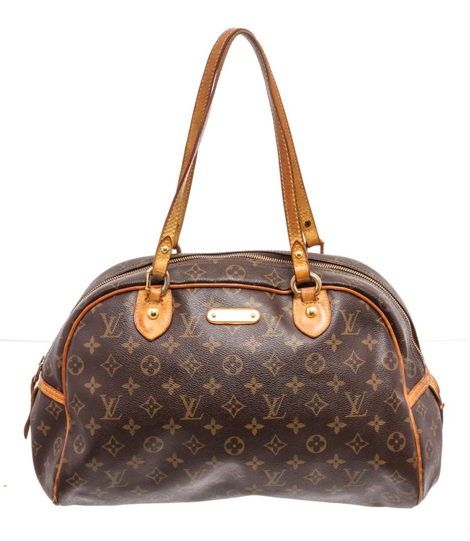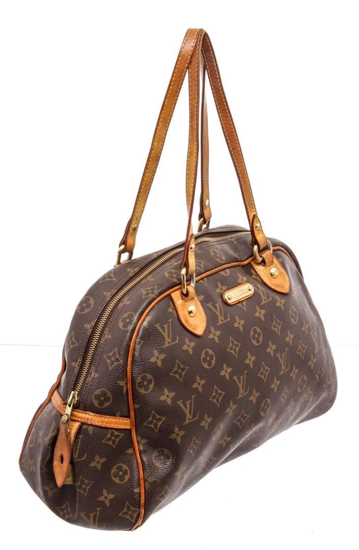 Louis Vuitton Brown Monogram Montorgueil PM Shoulder Bag with gold-tone hardware, tan vachetta leather trim, interior slip pockets, canvas lining, Leather shoulder strap, and zip closure.
