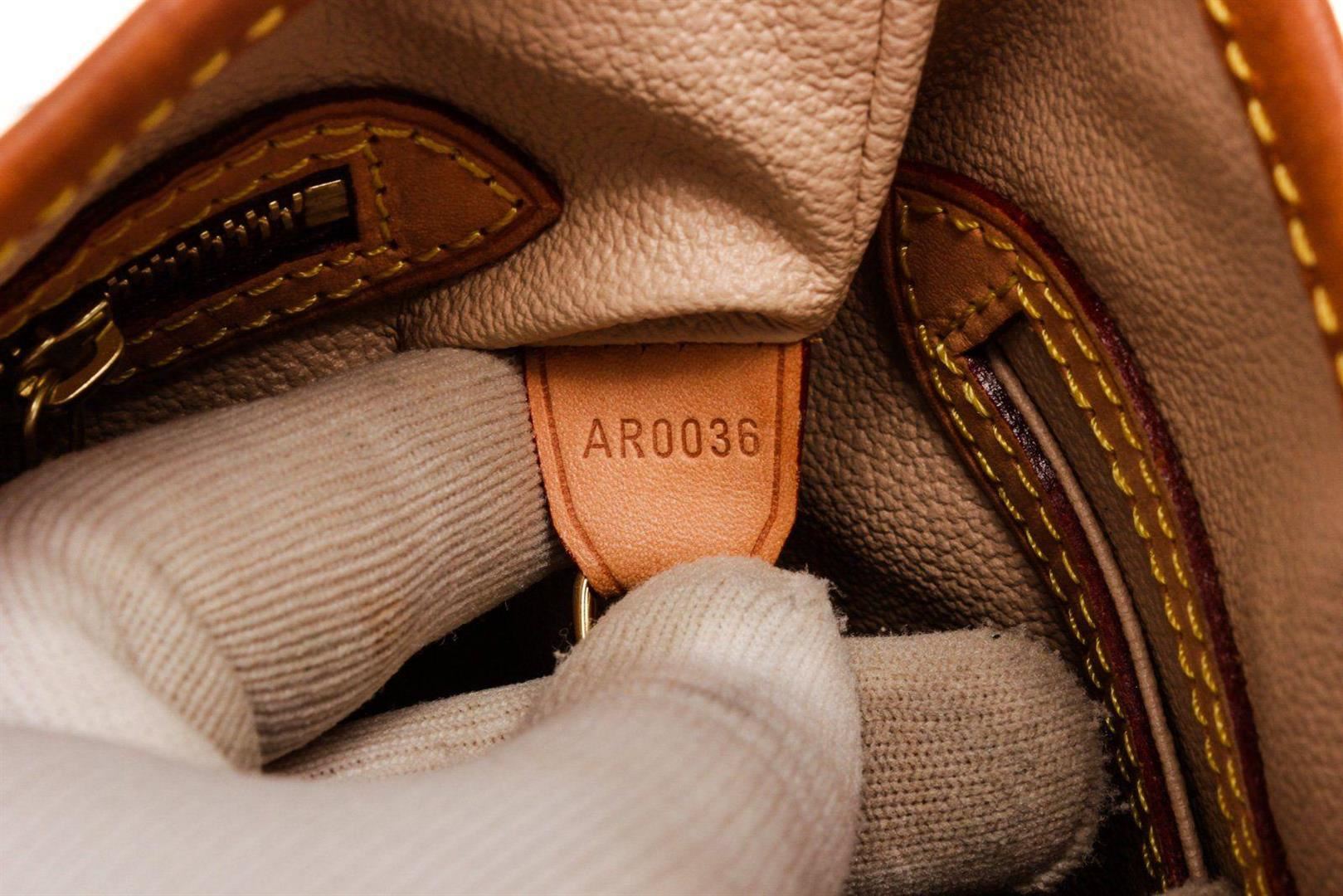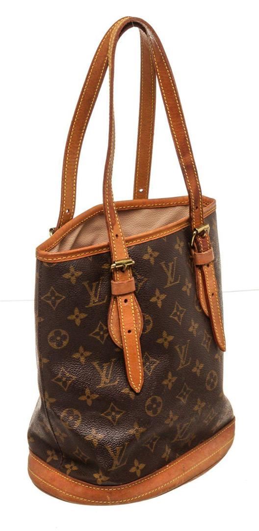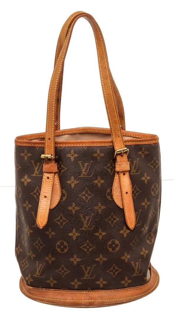 Louis Vuitton Brown Monogram PM Bucket Bag with material monogram canvas, gold-tone hardware, trim tan vachetta leather, interior zip pocket, shoulder strap and flap closure.
