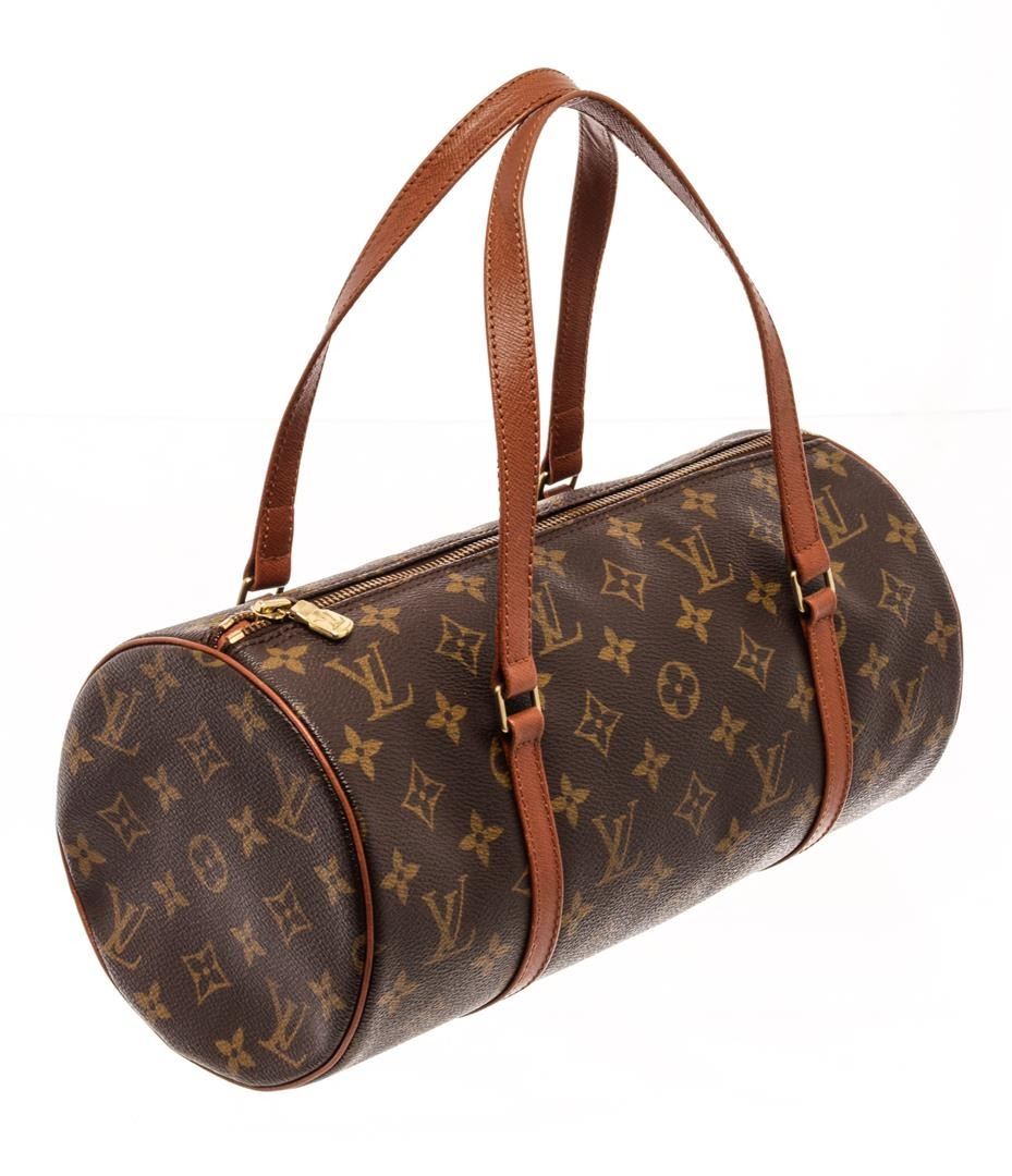Louis Vuitton Brown Monogram Papillon 30 Shoulder Bag. All available information is listed in the description and shown in the photos. Louis Vuitton Brown Monogram Papillon 30 Shoulder Bag with brown, printed, brass hardware, dual shoulder straps, leather trim embellishment, leather lining, zip closure at top Height: 8.5" Width: 11.25" Depth: 5.25" Shoulder Strap Drop: 6.75" / Height: 21.59" Width: 28.57" Depth: 13.33" Shoulder Strap Drop: 17.14"