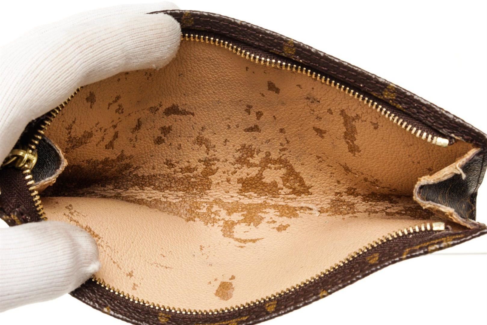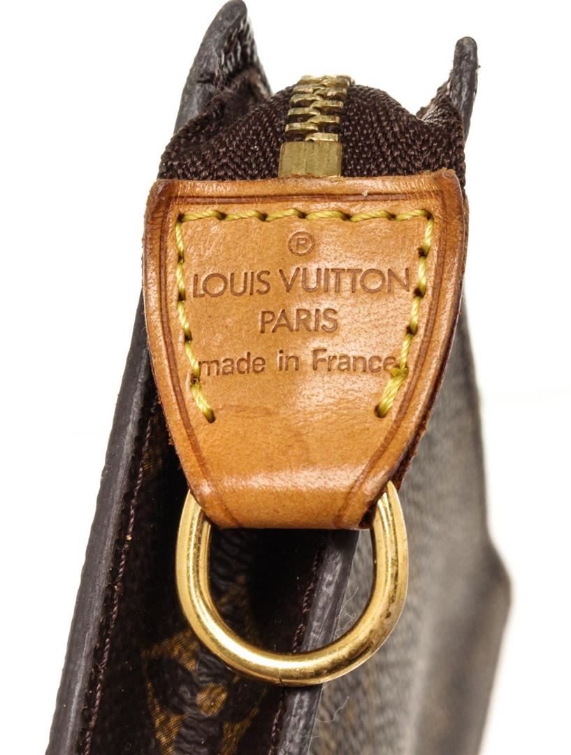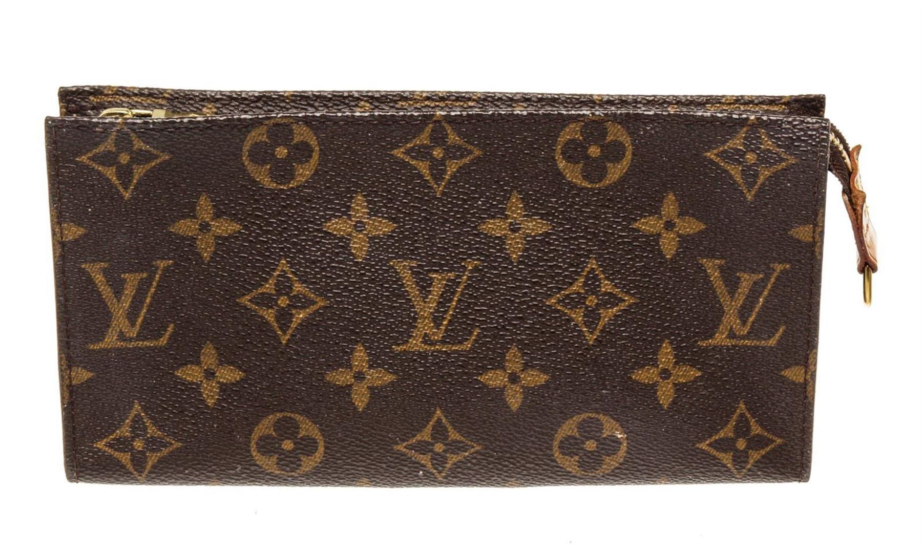 Louis Vuitton Brown Monogram Pouch Wallet with monogram canvas, gold-tone hardware, trim tan vachetta leather and zipper closure.