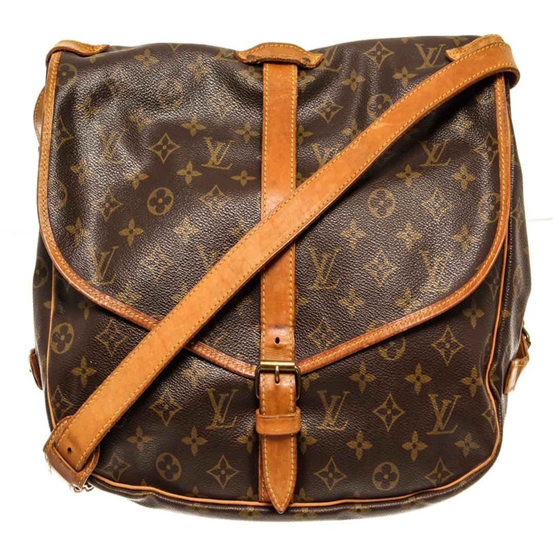 One Louis Vuitton Brown Monogram Saumur 35 Shoulder Bag. Item is sold AS-IS. All available information is listed in the description and shown in the photo. Louis Vuitton brown monogram Saumur 35 shoulder bag features a monogram canvas exterior, brown fabric lining, a contrasting vachetta leather strap, front flaps with belt buckle closures, dual interior compartments, and interior slip pockets. Vachetta is stained and cracking, Height: 10.6" Width: 9.4" Depth: 8.7", Handle Drop: / 26.92 x 23.87 x 22.09 Cm