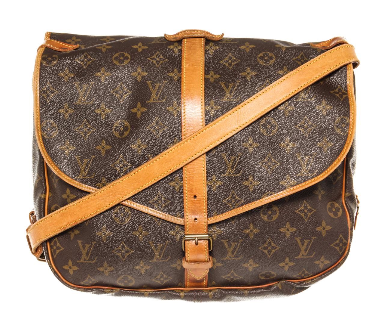 Louis Vuitton Brown Monogram Saumur 35cm Crossbody Bag. All available information is listed in the description and shown in the photos. Louis Vuitton Brown Monogram Saumur 35cm Crossbody Bag with gold-tone hardware, tan vachetta leather trim, interior zip pockets, canvas lining, leather shoulder strap, and flap closure.