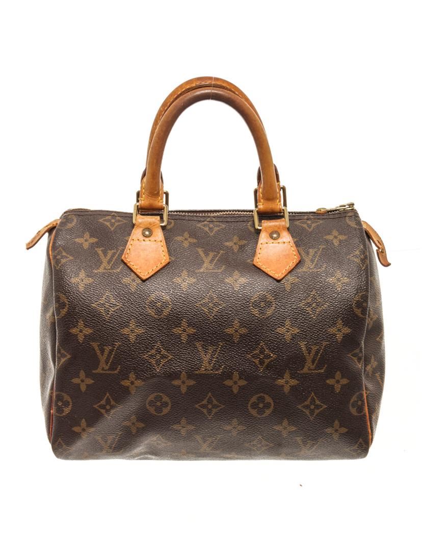 One Louis Vuitton Brown Monogram Speedy 25 Handbag. Item is sold AS-IS. All available information is listed in the description and shown in the photo. Louis Vuitton Brown Monogram Speedy 25 Handbag, brown printed, brass hardware, rolled handles, canvas lining & single interior pocket, zip closure at top. Height: 8", Width: 9.75", Depth: 5.5", Handle Drop: 3.75" / 20.32 x 24.76 x 13.97 Cm, Handle Drop: 9.52 CM