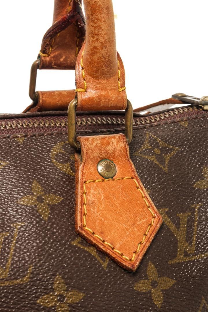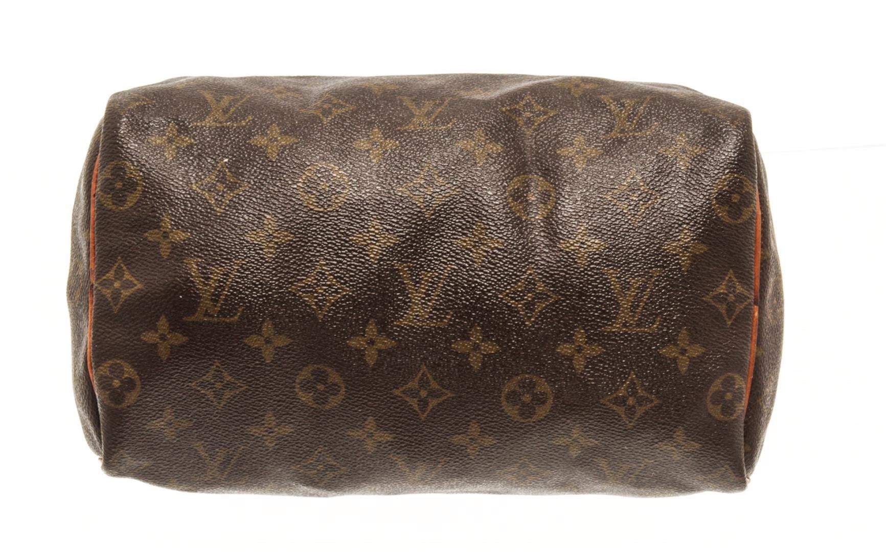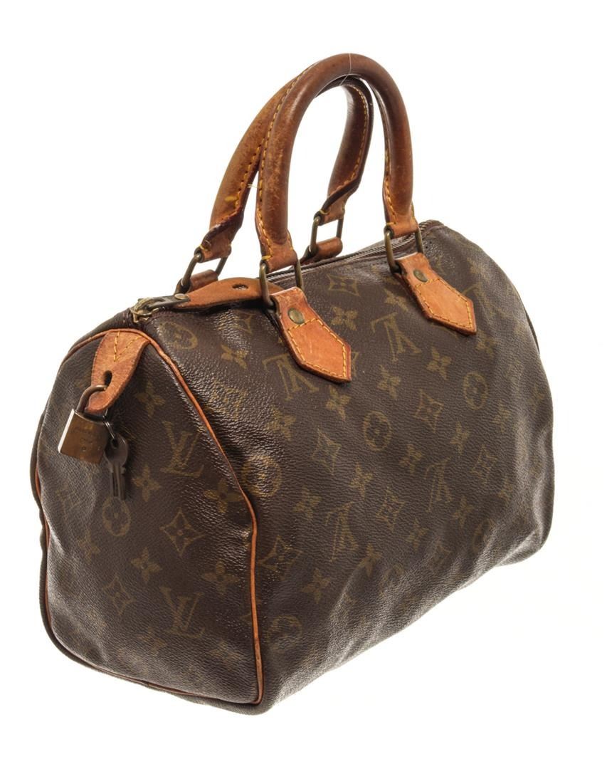One Louis Vuitton Brown Monogram Speedy 25 Handbag. Item is sold AS-IS. All available information is listed in the description and shown in the photo. Louis Vuitton Brown Monogram Speedy 25 Handbag with monogram canvas, vachetta handles and trim, a top zip closure, and an interior pocket. 7.5" L x 9.8" W x 5.9" D, 3.5" drop / 19.05 L x 24.89 W x 14.98 D CM, 8.89 CM drop