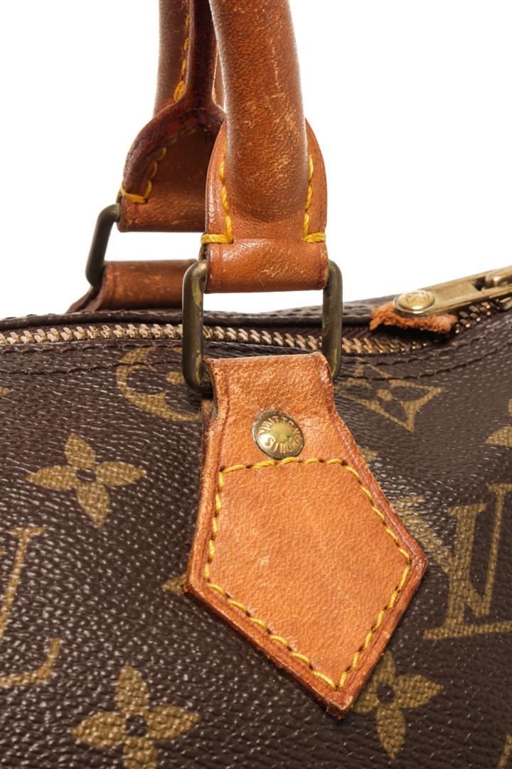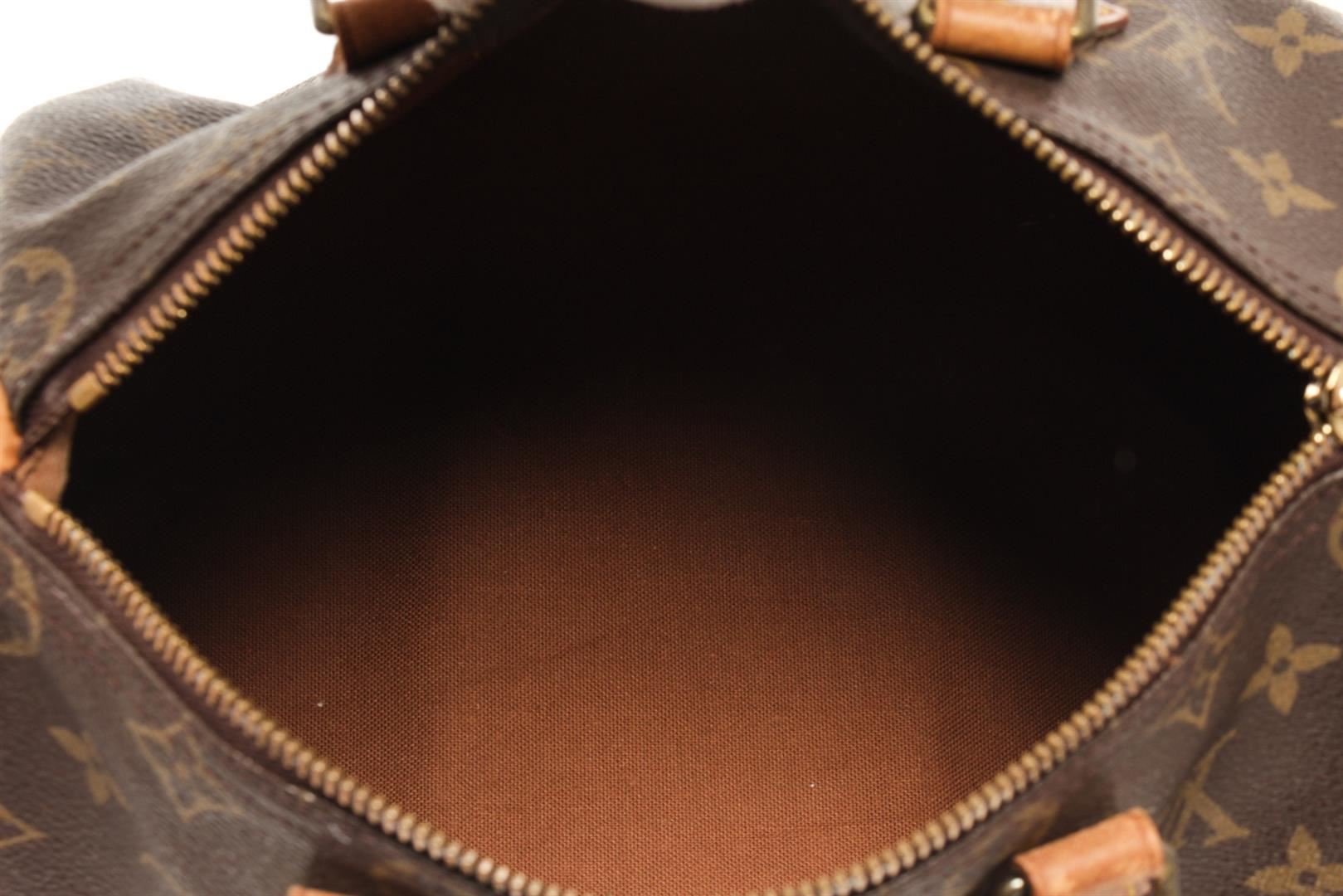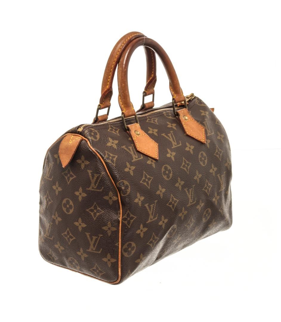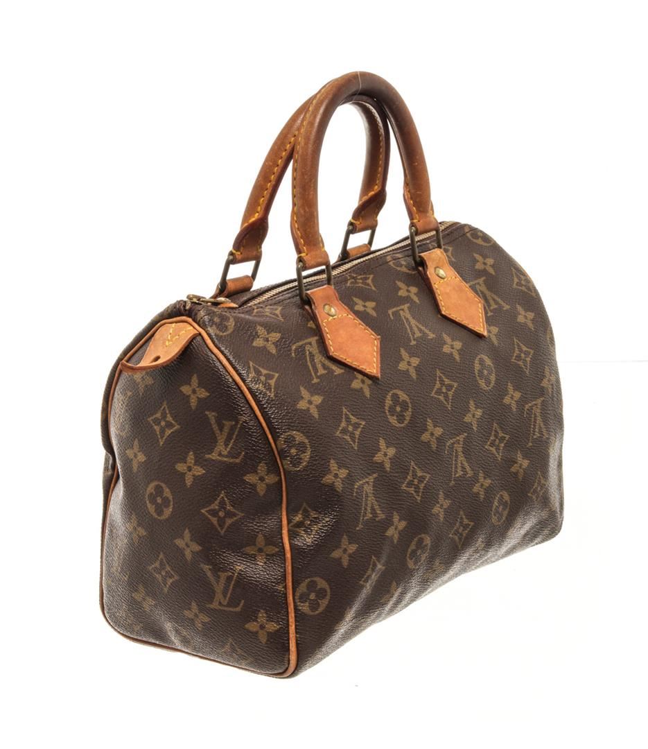 One Louis Vuitton Brown Monogram Speedy 25 Handbag. Item is sold AS-IS. All available information is listed in the description and shown in the photo. Louis Vuitton Brown Monogram Speedy 25 Handbag with brown monogram canvas, vachetta handles and trim, a top zip closure, and an interior pocket. 7.5" L x 9.8" W x 5.9" D, 3.5" drop / 19.05 L x 24.89 W x 14.98 D CM, 8.89 CM drop