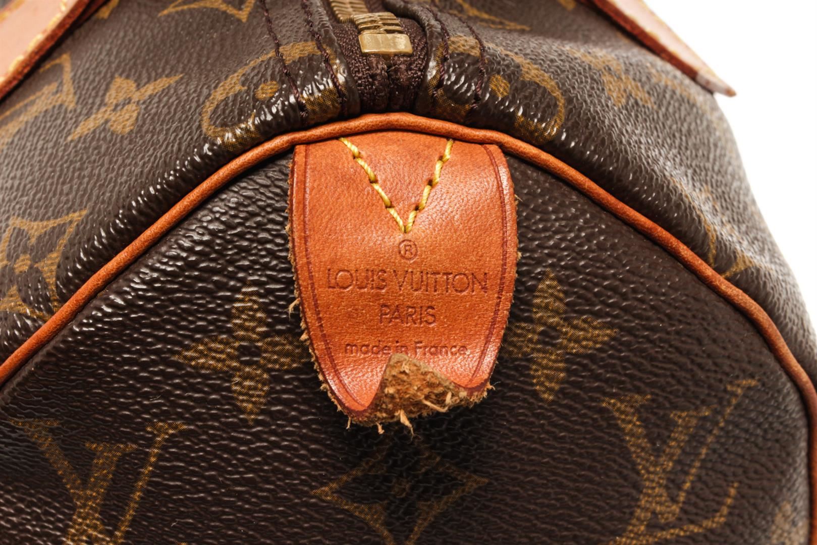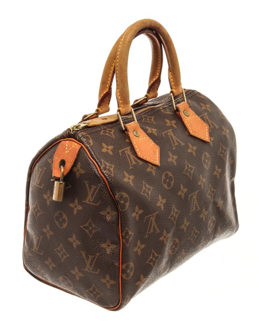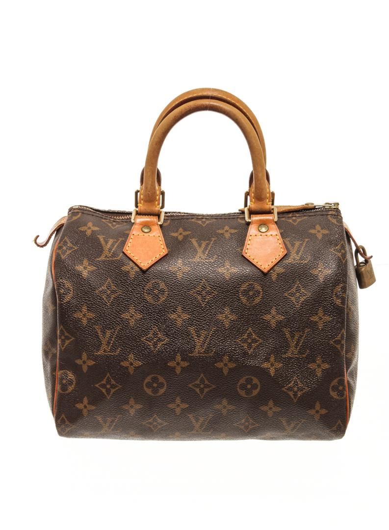 One Louis Vuitton Brown Monogram Speedy 25 Handbag. Item is sold AS-IS. All available information is listed in the description and shown in the photo. Louis Vuitton Brown Monogram Speedy 25 Handbag with brown and tan monogram coated canvas, brass hardware, tan vachetta leather trim, dual rolled top handles, brown interior canvas, single slit pocket at interior, zip closure on top. Height 7", Width 10", Depth 6", Handle Drop 3.25 Inch / 17.78 x 25.4 x 15.24 CM, Handle Drop 8.25 CM