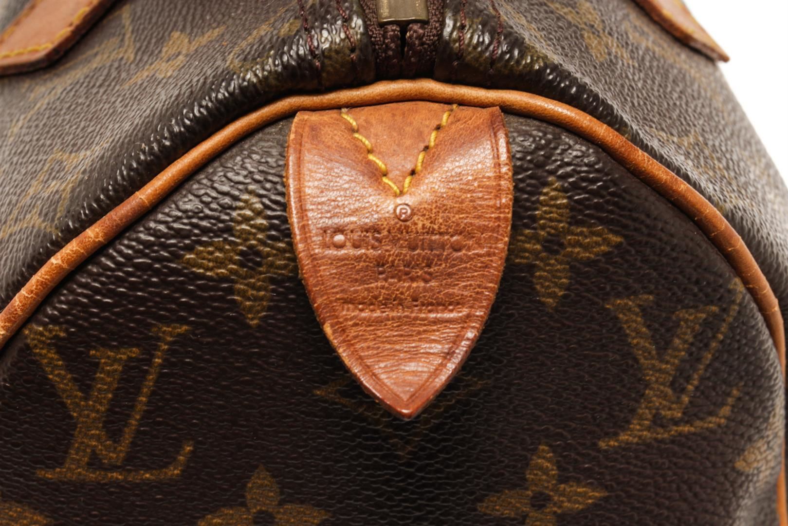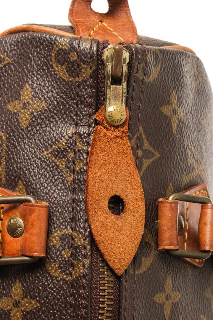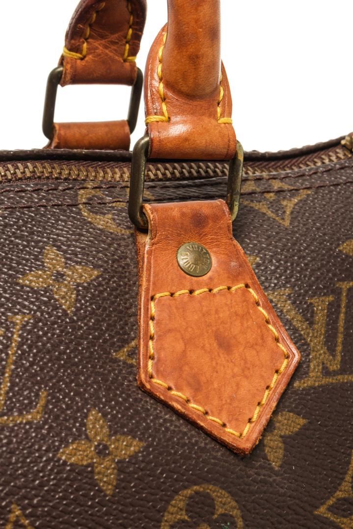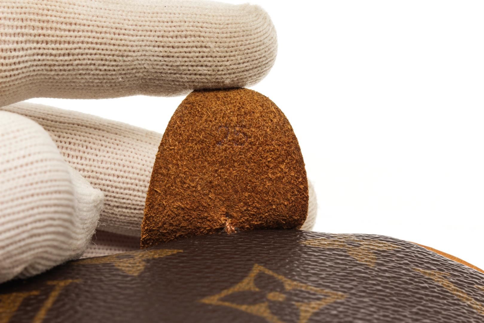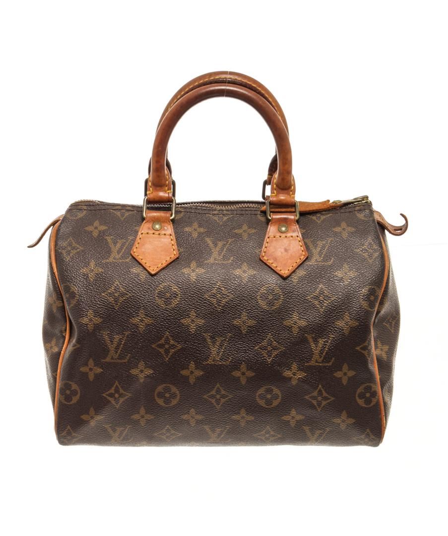 One Louis Vuitton Brown Monogram Speedy 25 Handbag. Item is sold AS-IS. All available information is listed in the description and shown in the photo. Louis Vuitton Brown Monogram Speedy 25 Handbag with brown and tan monogram coated canvas, brass hardware, tan vachetta leather trim, dual rolled top handles, brown interior canvas, single slit pocket at interior, zip closure on top. Height 7", Width 10", Depth 6", Handle Drop 3.25 Inch / 17.78 x 25.4 x 15.24 CM, Handle Drop 8.25 CM