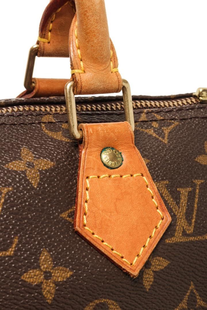One Louis Vuitton Brown Monogram Speedy 25 Handbag. Item is sold AS-IS. All available information is listed in the description and shown in the photo. Louis Vuitton Brown Monogram Speedy 25 Handbag with brown and tan monogram coated canvas, brass hardware, tan vachetta leather trim, dual rolled top handles, brown interior canvas, single slit pocket at interior, zip closure on top. Height 7", Width 10", Depth 6", Handle Drop 3.25 Inch / 17.78 x 25.4 x 15.24 CM, Handle Drop 8.25 CM