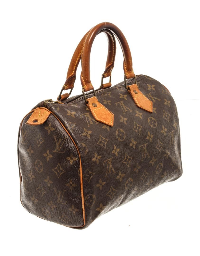 One Louis Vuitton Brown Monogram Speedy 25 Handbag. Item is sold AS-IS. All available information is listed in the description and shown in the photo. Louis Vuitton Brown Monogram Speedy 25 Handbag with brown louis vuitton monogram speedy 25 bag. the speedy 25 features the monogram canvas, vachetta handles and trim, a top zip closure, and an interior pocket. 7.5" L x 9.8" W x 5.9" D, 3.5" drop / 19.05 L x 24.89 W x 14.98 D CM, 8.89 CM drop