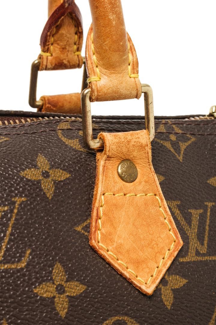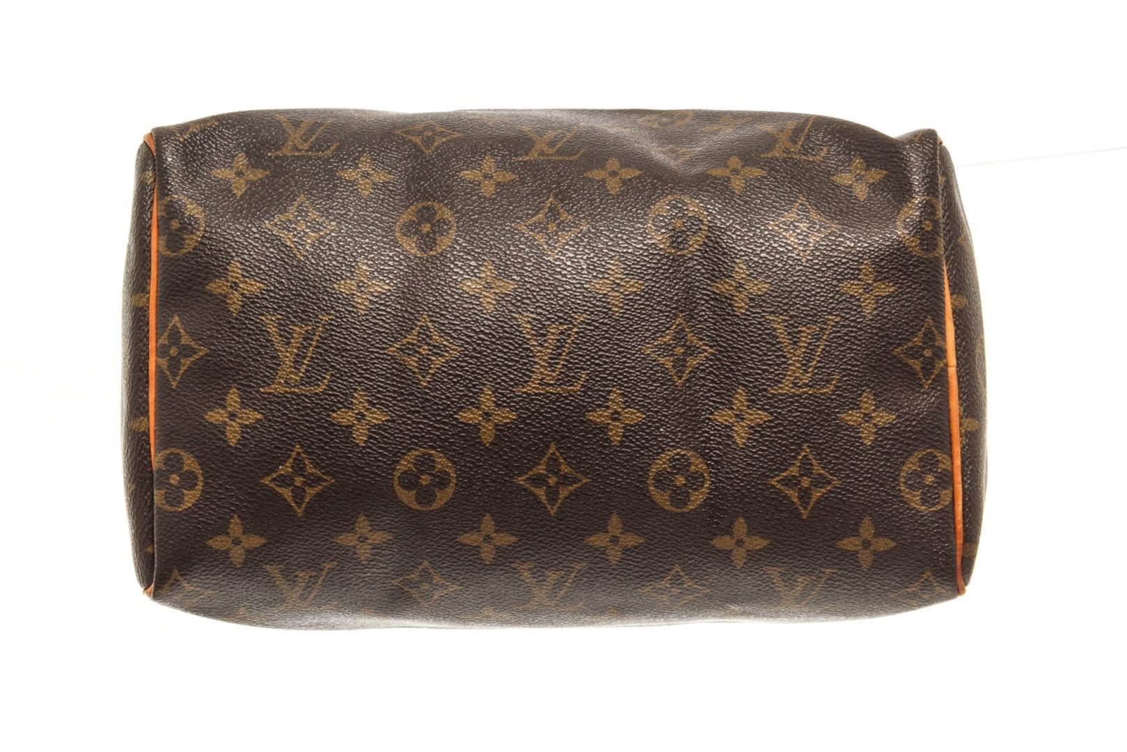 One Louis Vuitton Brown Monogram Speedy 25 Handbag. Item is sold AS-IS. All available information is listed in the description and shown in the photo. Louis Vuitton Brown Monogram Speedy 25 Handbag with brown canvas leather trim, monogram pattern circular top handles, top zip fastening main compartment, zip closure on top. Depth 4.7 in, Width 9.8 in / Depth 12 cm, Width 25 cm