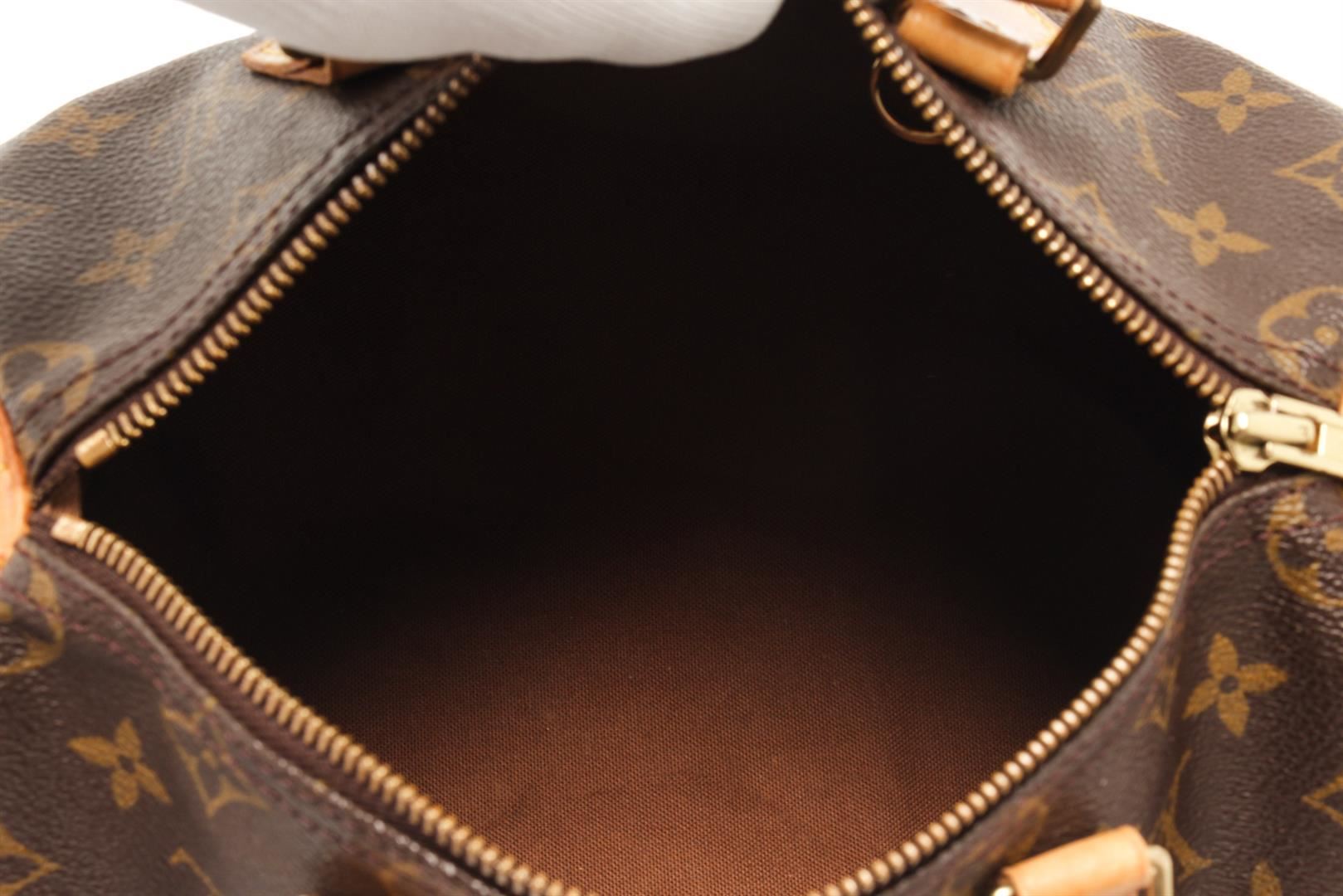 One Louis Vuitton Brown Monogram Speedy 25 Handbag. Item is sold AS-IS. All available information is listed in the description and shown in the photo. Louis Vuitton Brown Monogram Speedy 25 Handbag with gold tone hardware, monogram canvas, vachetta handles and trim, a top zip closure, and an interior pocket. 7.5" L x 9.8" W x 5.9" D, 3.5" drop / 19.05 L x 24.89 W x 14.98 D CM, 8.89 CM drop