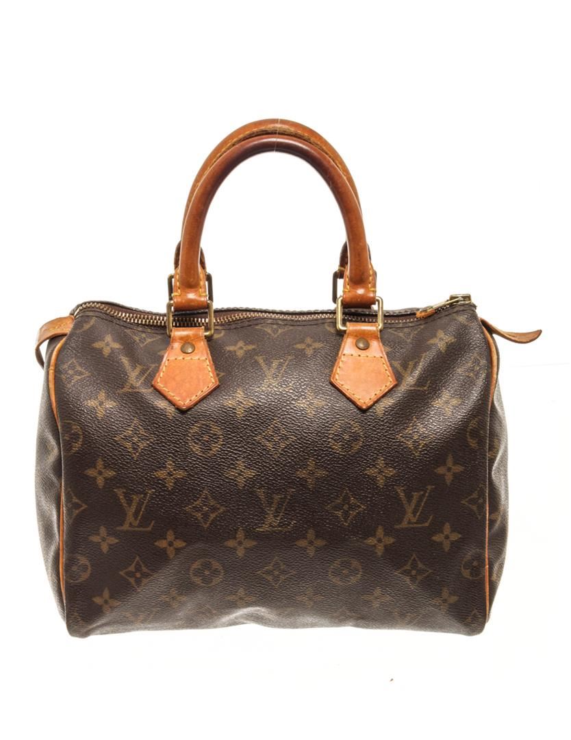 One Louis Vuitton Brown Monogram Speedy 25 Handbag. Item is sold AS-IS. All available information is listed in the description and shown in the photo. Louis Vuitton Brown Monogram Speedy 25 Handbag with brown louis vuitton monogram speedy 25 bag. the speedy 25 features the monogram canvas, vachetta handles and trim, a top zip closure, and an interior pocket. 7.5" L x 9.8" W x 5.9" D, 3.5" drop / 19.05 L x 24.89 W x 14.98 D CM, 8.89 CM drop