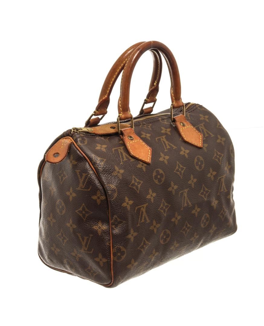 One Louis Vuitton Brown Monogram Speedy 25 Satchel Bag. Item is sold AS-IS. All available information is listed in the description and shown in the photo. Louis Vuitton Brown Monogram Speedy 25 Satchel Bag with gold tone hardware, monogram canvas, vachetta handles and trim, a top zip closure, and an interior pocket. 7.5" L x 9.8" W x 5.9" D, 3.5" drop / 19.05 L x 24.89 W x 14.98 D CM, 8.89 CM drop