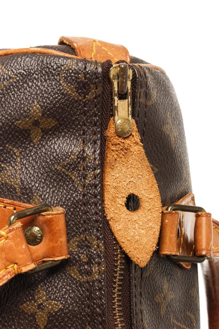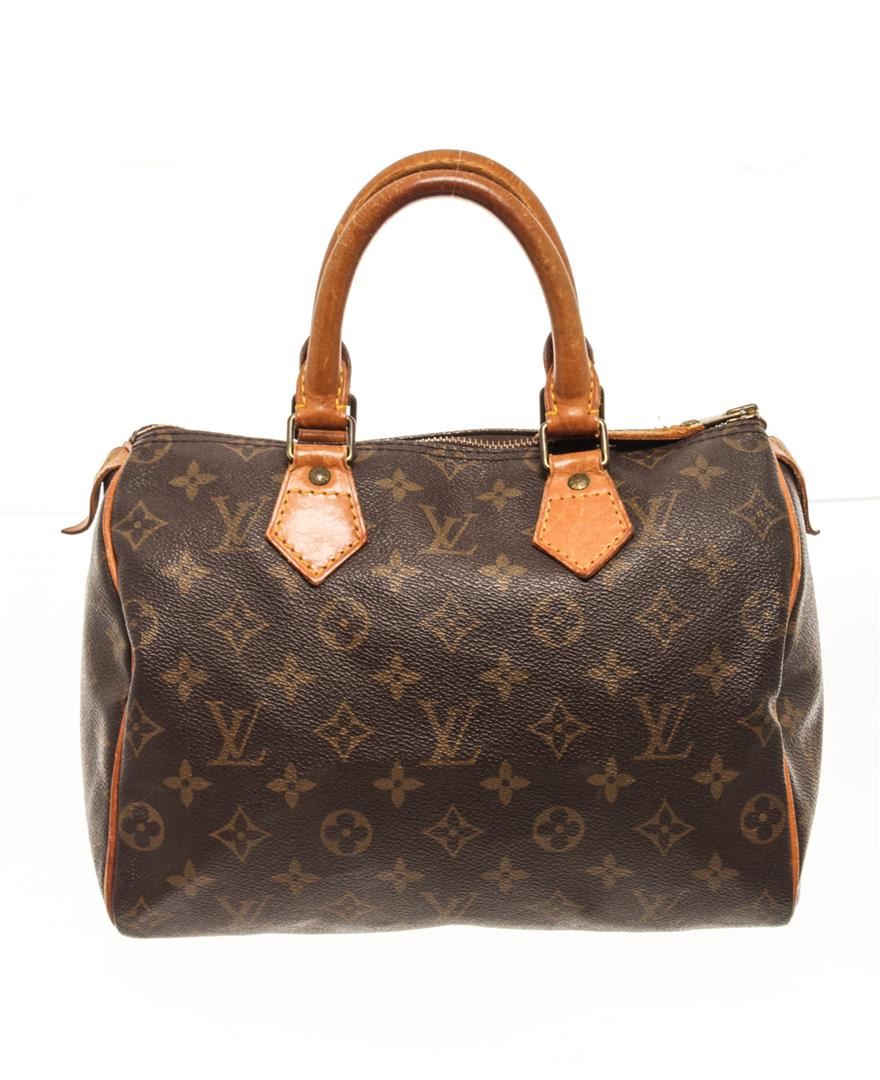 One Louis Vuitton Brown Monogram Speedy 25 Satchel Bag. Item is sold AS-IS. All available information is listed in the description and shown in the photo. Louis Vuitton Brown Monogram Speedy 25 Satchel Bag with, brown, printed, brass hardware, rolled handles, canvas lining & single interior pocket, zip closure at top. Height: 8", Width: 9.75", Depth: 5.5", Handle Drop: 3.75" / 20.32 x 24.76 x 13.97 Cm, Handle Drop: 9.52 CM