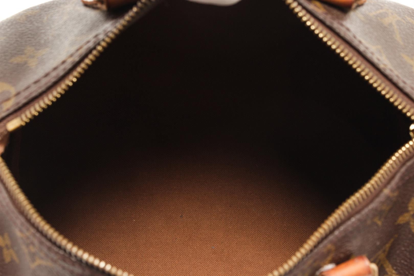 One Louis Vuitton Brown Monogram Speedy 25 Satchel Bag. Item is sold AS-IS. All available information is listed in the description and shown in the photo. Louis Vuitton Brown Monogram Speedy 25 Satchel Bag with gold tone hardware, monogram canvas, vachetta handles and trim, a top zip closure, and an interior pocket. 7.5" L x 9.8" W x 5.9" D, 3.5" drop / 19.05 L x 24.89 W x 14.98 D CM, 8.89 CM drop