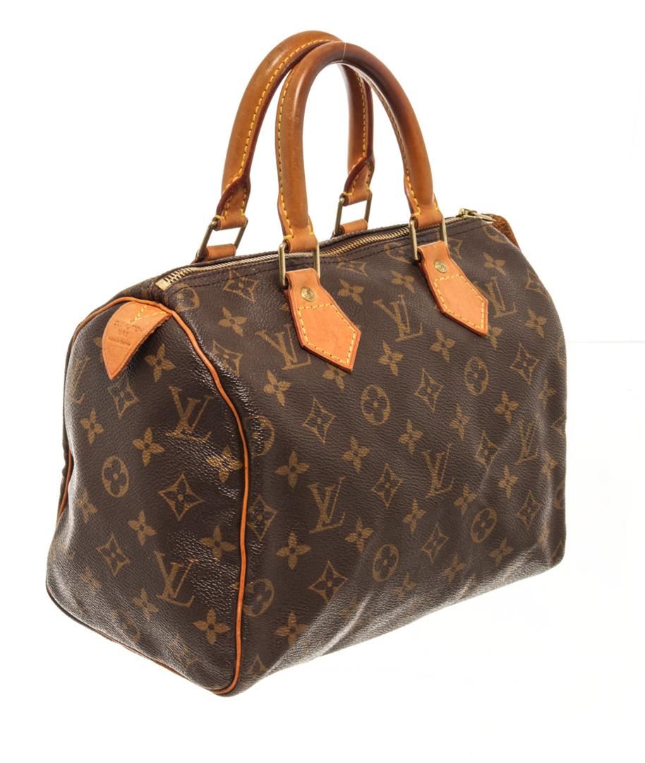 One Louis Vuitton Brown Monogram Speedy 25 Satchel Bag. Item is sold AS-IS. All available information is listed in the description and shown in the photo. Louis Vuitton Brown Monogram Speedy 25 Satchel Bag with brown louis vuitton monogram speedy 25 bag. the speedy 25 features the monogram canvas, vachetta handles and trim, a top zip closure, and an interior pocket. 7.5" L x 9.8" W x 5.9" D, 3.5" drop / 19.05 L x 24.89 W x 14.98 D CM, 8.89 CM drop