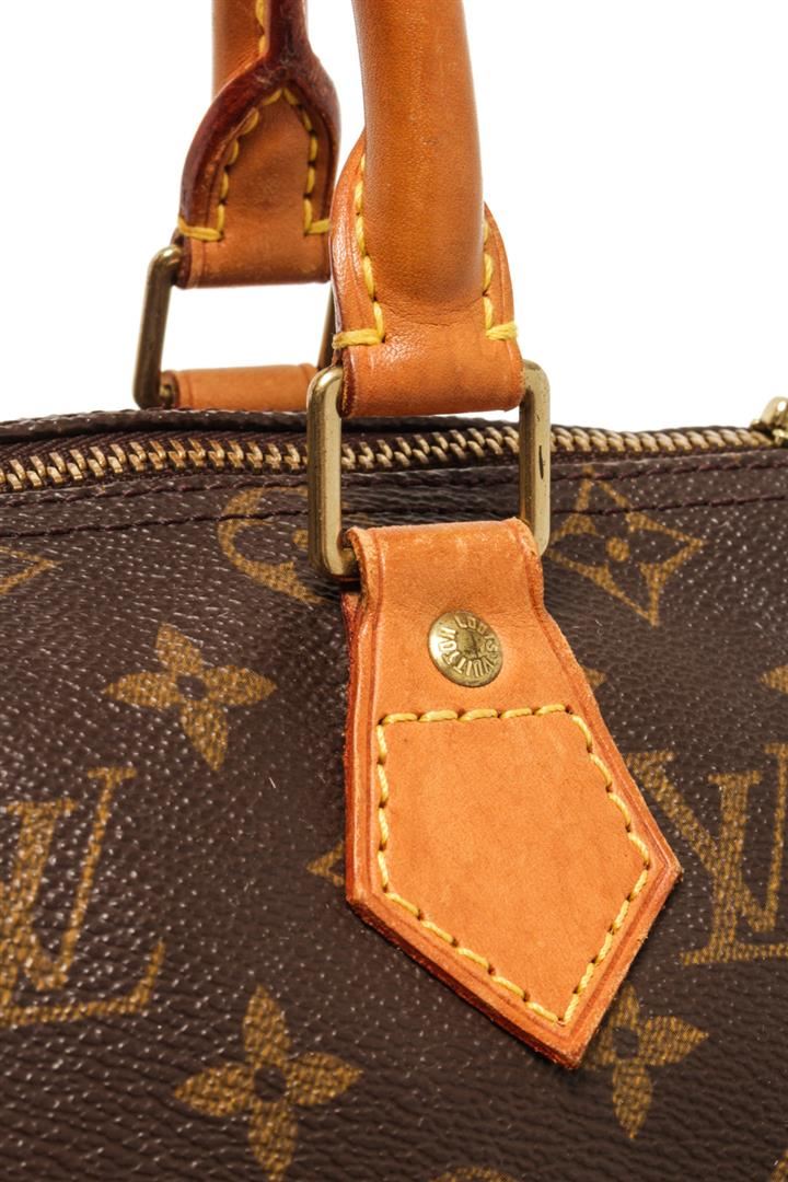 One Louis Vuitton Brown Monogram Speedy 25 Satchel Bag. Item is sold AS-IS. All available information is listed in the description and shown in the photo. Louis Vuitton Brown Monogram Speedy 25 Satchel Bag with brown louis vuitton monogram speedy 25 bag. the speedy 25 features the monogram canvas, vachetta handles and trim, a top zip closure, and an interior pocket. 7.5" L x 9.8" W x 5.9" D, 3.5" drop / 19.05 L x 24.89 W x 14.98 D CM, 8.89 CM drop