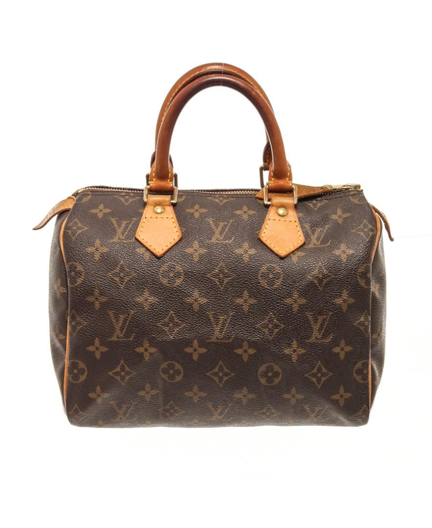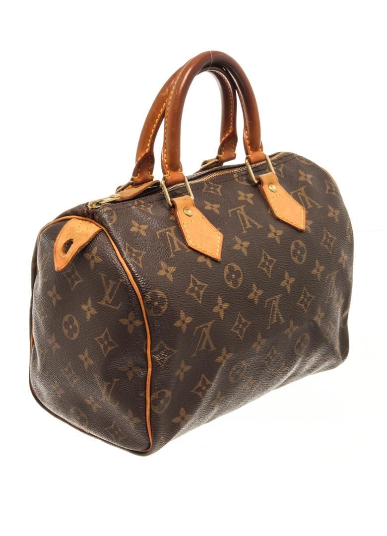 One Louis Vuitton Brown Monogram Speedy 25 Satchel Bag. Item is sold AS-IS. All available information is listed in the description and shown in the photo. Louis Vuitton Brown Monogram Speedy 25 Satchel Bag with brown louis vuitton monogram speedy 25 bag. the speedy 25 features the monogram canvas, vachetta handles and trim, a top zip closure, and an interior pocket. 7.5" L x 9.8" W x 5.9" D, 3.5" drop / 19.05 L x 24.89 W x 14.98 D CM, 8.89 CM drop