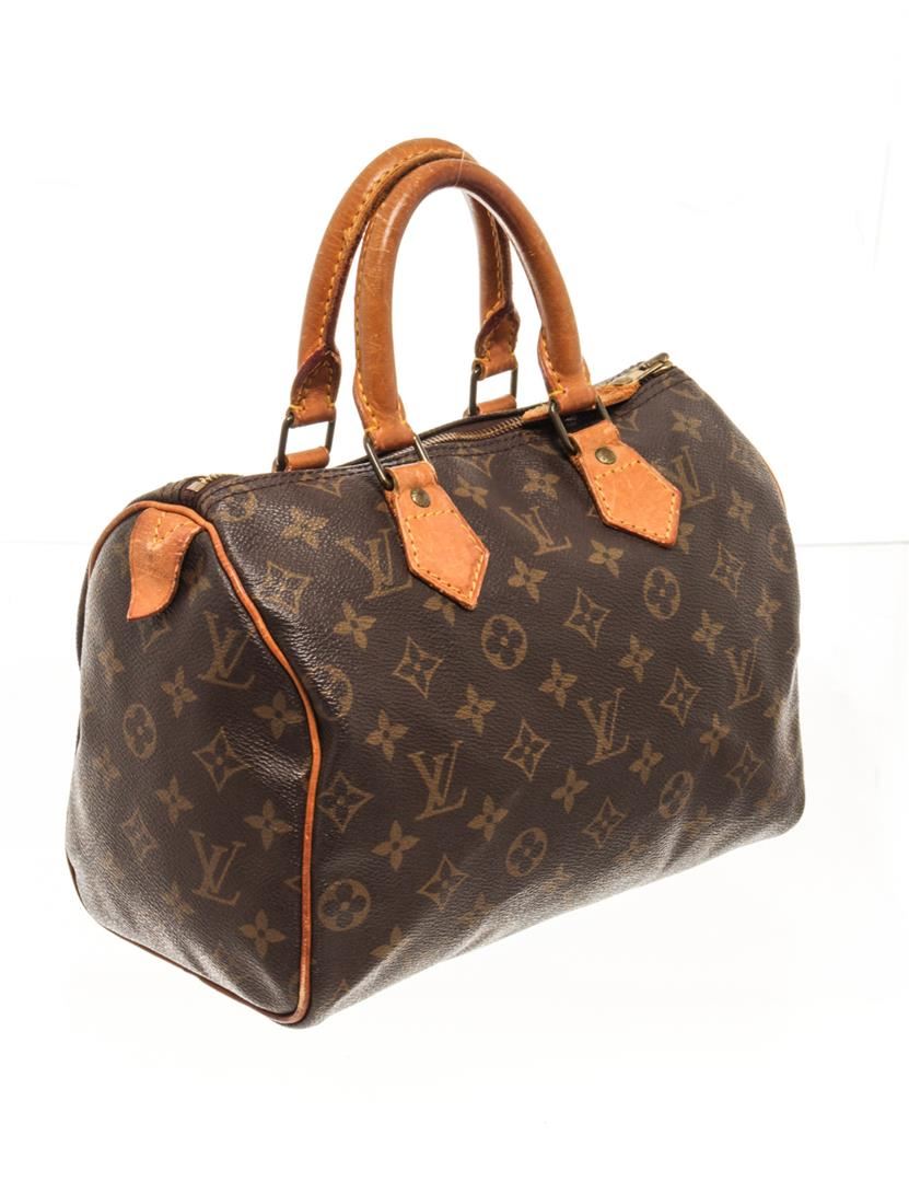One Louis Vuitton Brown Monogram Speedy 25 Satchel Bag. Item is sold AS-IS. All available information is listed in the description and shown in the photo. Louis Vuitton Brown Monogram Speedy 25 Satchel Bag with, brown, printed, brass hardware, rolled handles, canvas lining & single interior pocket, zip closure at top. Height: 8", Width: 9.75", Depth: 5.5", Handle Drop: 3.75" / 20.32 x 24.76 x 13.97 Cm, Handle Drop: 9.52 CM
