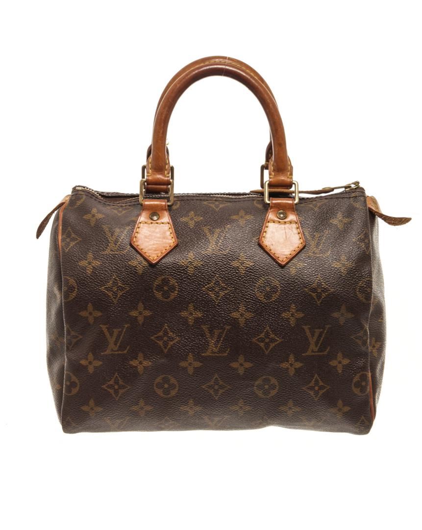 One Louis Vuitton Brown Monogram Speedy 25 Satchel Bag. Item is sold AS-IS. All available information is listed in the description and shown in the photo. Louis Vuitton Brown Monogram Speedy 25 Satchel Bag with gold tone hardware, monogram canvas, vachetta handles and trim, a top zip closure, and an interior pocket. 7.5" L x 9.8" W x 5.9" D, 3.5" drop / 19.05 L x 24.89 W x 14.98 D CM, 8.89 CM drop