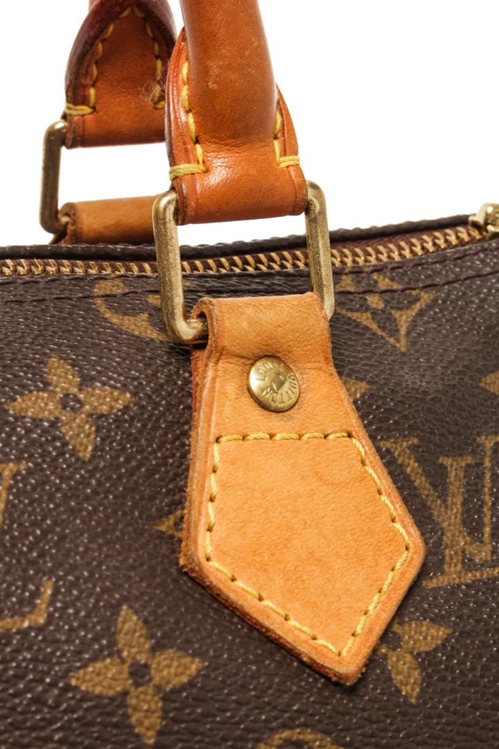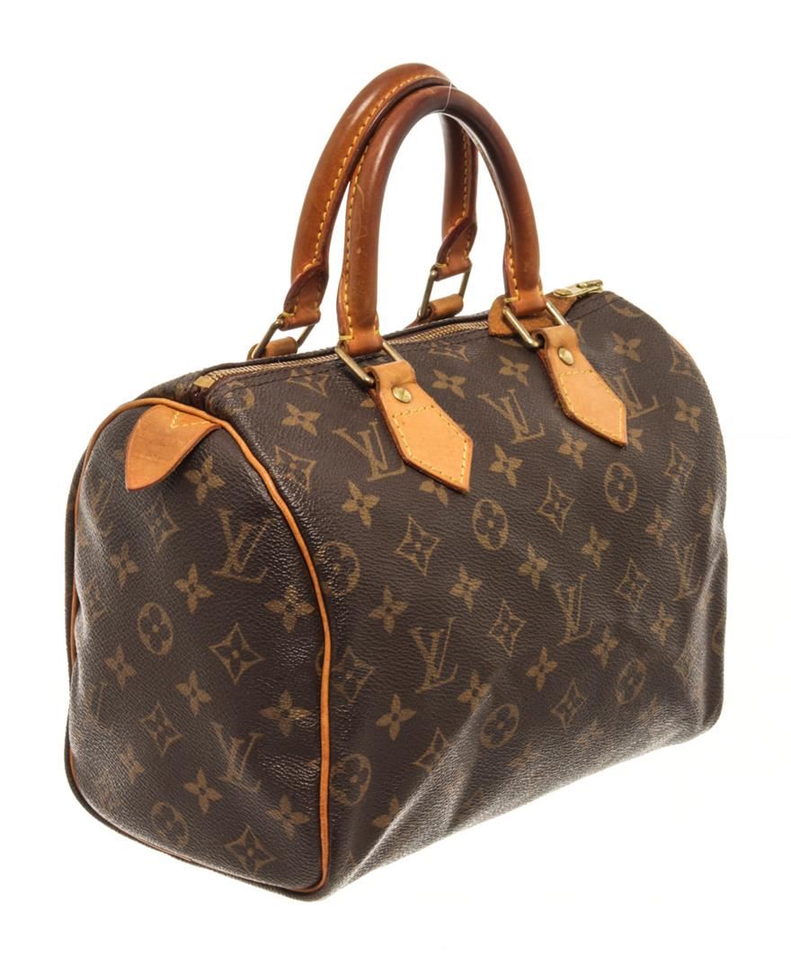 One Louis Vuitton Brown Monogram Speedy 25 Satchel Bag. Item is sold AS-IS. All available information is listed in the description and shown in the photo. Louis Vuitton Brown Monogram Speedy 25 Satchel Bag with brown louis vuitton monogram speedy 25 bag. the speedy 25 features the monogram canvas, vachetta handles and trim, a top zip closure, and an interior pocket. 7.5" L x 9.8" W x 5.9" D, 3.5" drop / 19.05 L x 24.89 W x 14.98 D CM, 8.89 CM drop