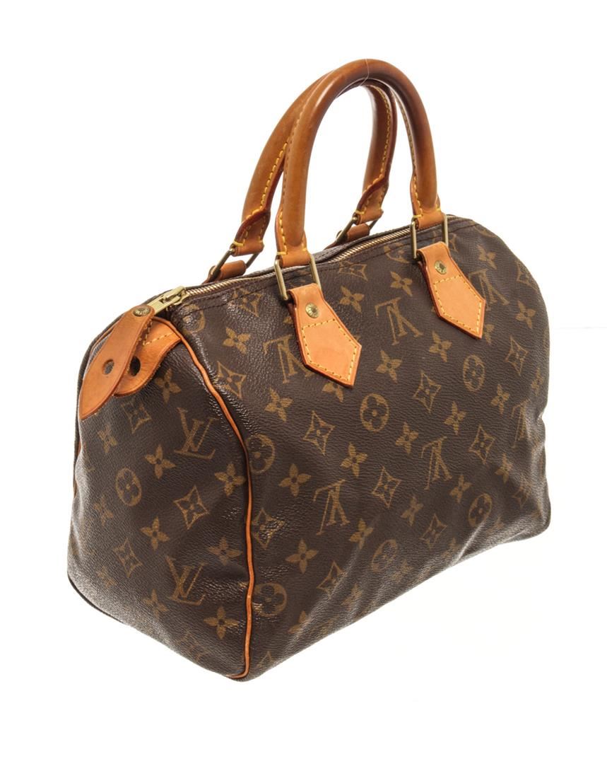 One Louis Vuitton Brown Monogram Speedy 25 Satchel Bag. Item is sold AS-IS. All available information is listed in the description and shown in the photo. Louis Vuitton Brown Monogram Speedy 25 Satchel Bag with brown louis vuitton monogram speedy 25 bag. the speedy 25 features the monogram canvas, vachetta handles and trim, a top zip closure, and an interior pocket. 7.5" L x 9.8" W x 5.9" D, 3.5" drop / 19.05 L x 24.89 W x 14.98 D CM, 8.89 CM drop
