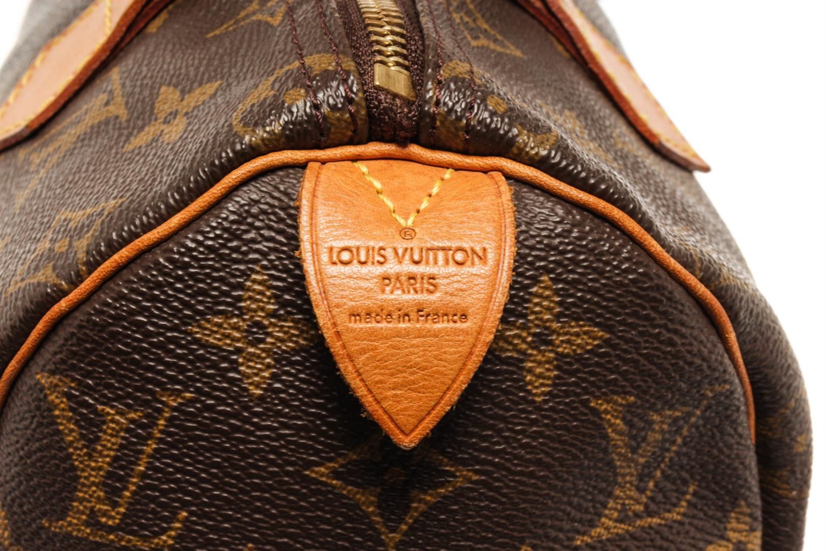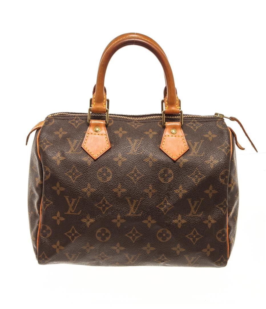 One Louis Vuitton Brown Monogram Speedy 25 Satchel Bag. Item is sold AS-IS. All available information is listed in the description and shown in the photo. Louis Vuitton Brown Monogram Speedy 25 Satchel Bag with brown louis vuitton monogram speedy 25 bag. the speedy 25 features the monogram canvas, vachetta handles and trim, a top zip closure, and an interior pocket. 7.5" L x 9.8" W x 5.9" D, 3.5" drop / 19.05 L x 24.89 W x 14.98 D CM, 8.89 CM drop