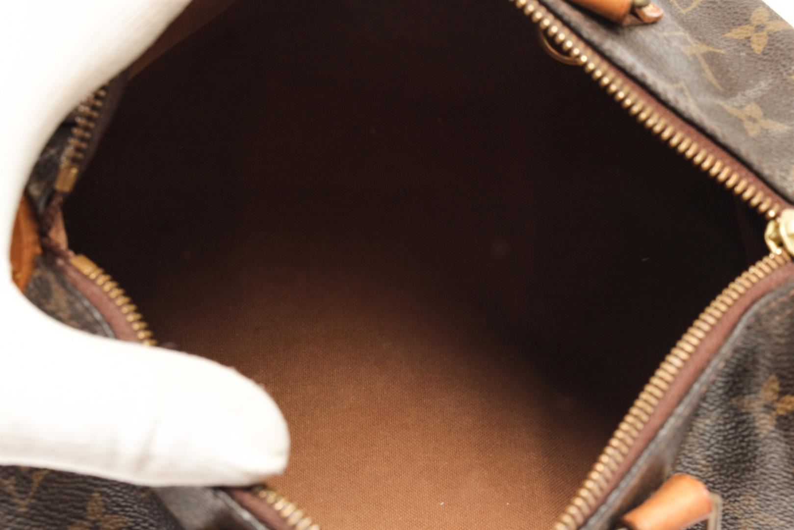 One Louis Vuitton Brown Monogram Speedy 25 Satchel Bag. Item is sold AS-IS. All available information is listed in the description and shown in the photo. Louis Vuitton Brown Monogram Speedy 25 Satchel Bag with gold tone hardware, brown canvas leather trim, monogram pattern circular top handles, top zip fastening main compartment, zip closure on top. Depth 4.7 in, Width 9.8 in / Depth 12 cm, Width 25 cm