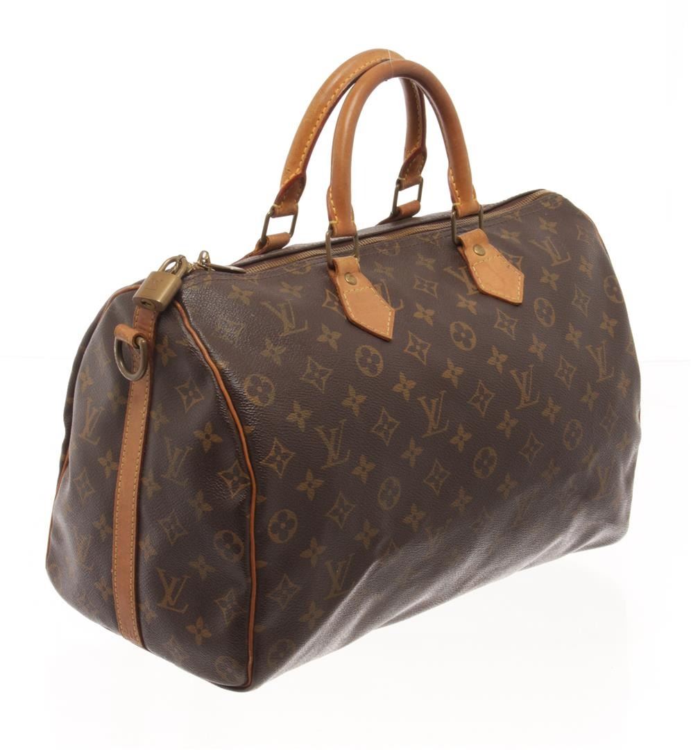 One Louis Vuitton Brown Monogram Speedy 35 Bandouliere. Item is sold AS-IS. All available information is listed in the description and shown in the photo. louis vuitton brown monogram canvas speedy 35 bandoulie satchel bag with gold-tone hardware, internal slip pocket, leather trim, two rolled top handles, main compartment top zip fastening. Depth 7.9 in, Handle 3.9 in, Height 9.1 in, Width 13.8 in / Depth 20 cm, Handle 10 cm, Height 23 cm, Width 35 cm