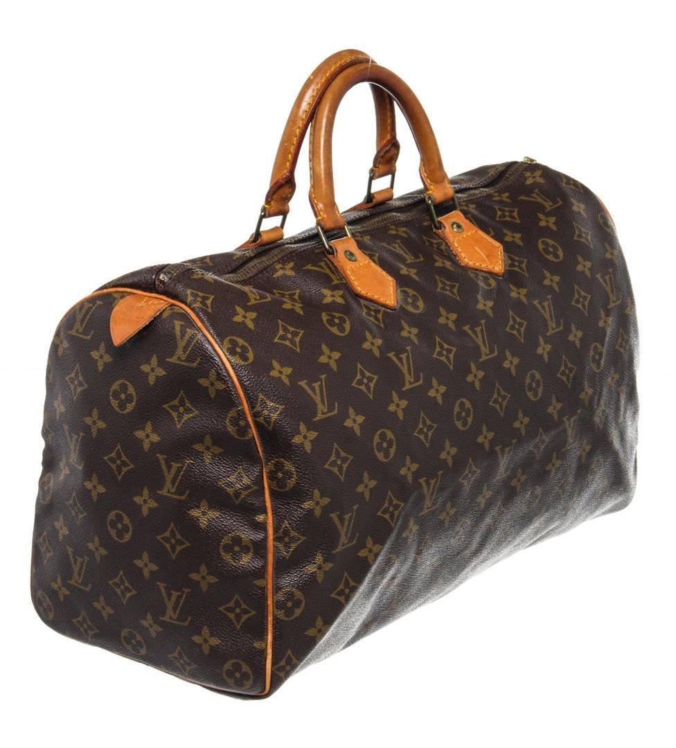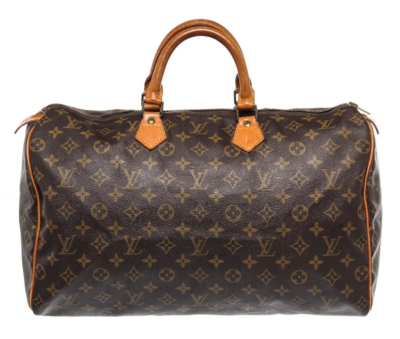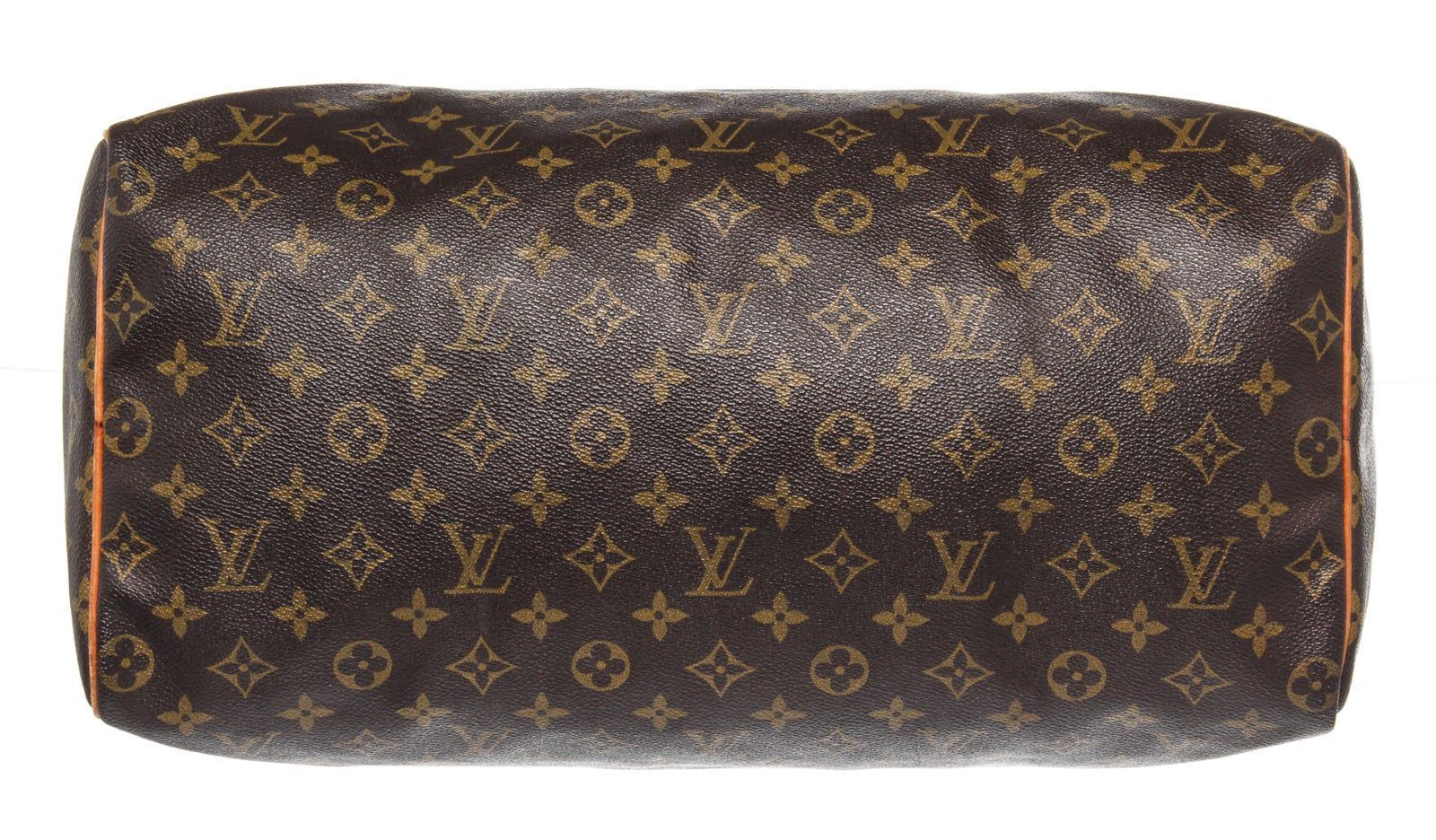 Louis Vuitton Brown Monogram Speedy 40cm Satchel Bag with monogram canvas gold-tone hardware, trim tan vachetta leather, dual top handle and zipper closure.