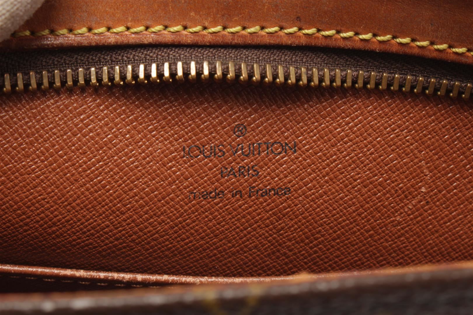 One Louis Vuitton Brown Monogram canvas Drouot Crossbody Bag. Item is sold AS-IS. All available information is listed in the description and shown in the photo. Louis Vuitton Brown Monogram canvas Drouot Crossbody Bag with adjustable shoulder strap, leather lining, interior slip pocket, gold tone hardware, zipper closure. There are some wear and water stains on the vachetta. Please refer to photos. Depth 3.9 in, Height 8.7 in, Width 9.4 in / Depth 10 cm, Height 22 cm, Width 24 cm