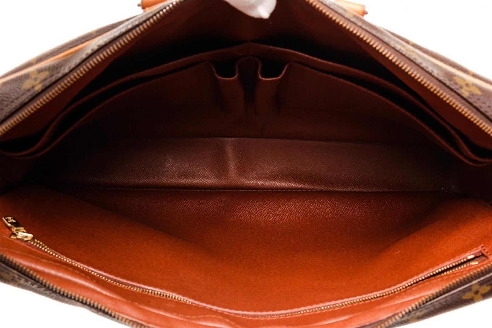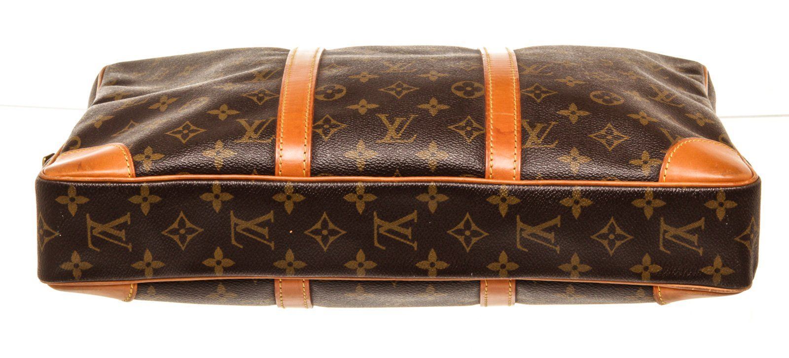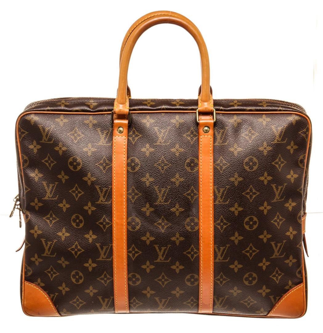 Louis Vuitton Brown Porte Document Voyage Briefcases with material monogram canvas gold-tone hardware, trim tan vachetta leather, interior three pocket, canvas lining, dual top handle and zipper closure.