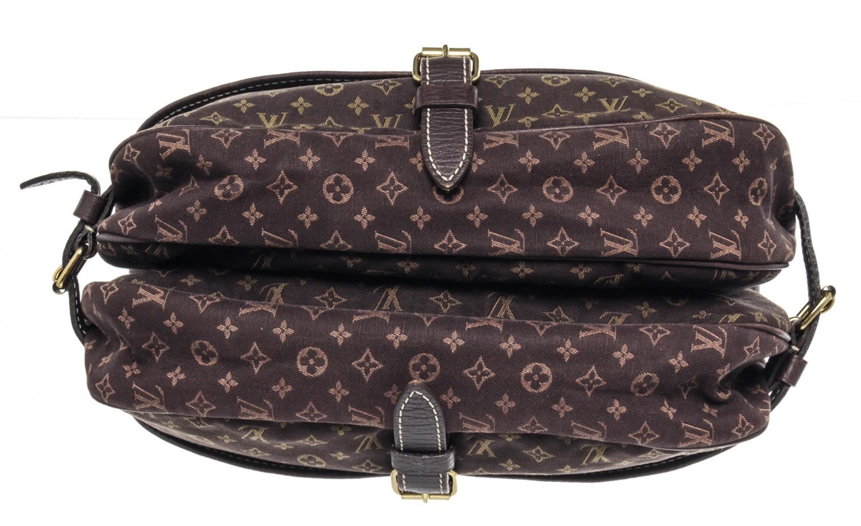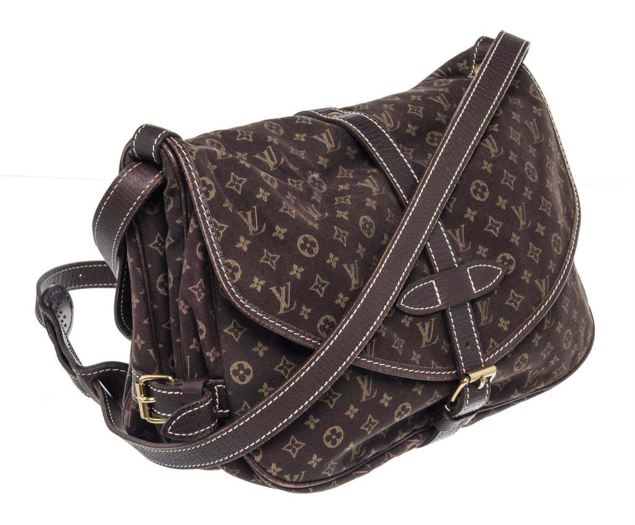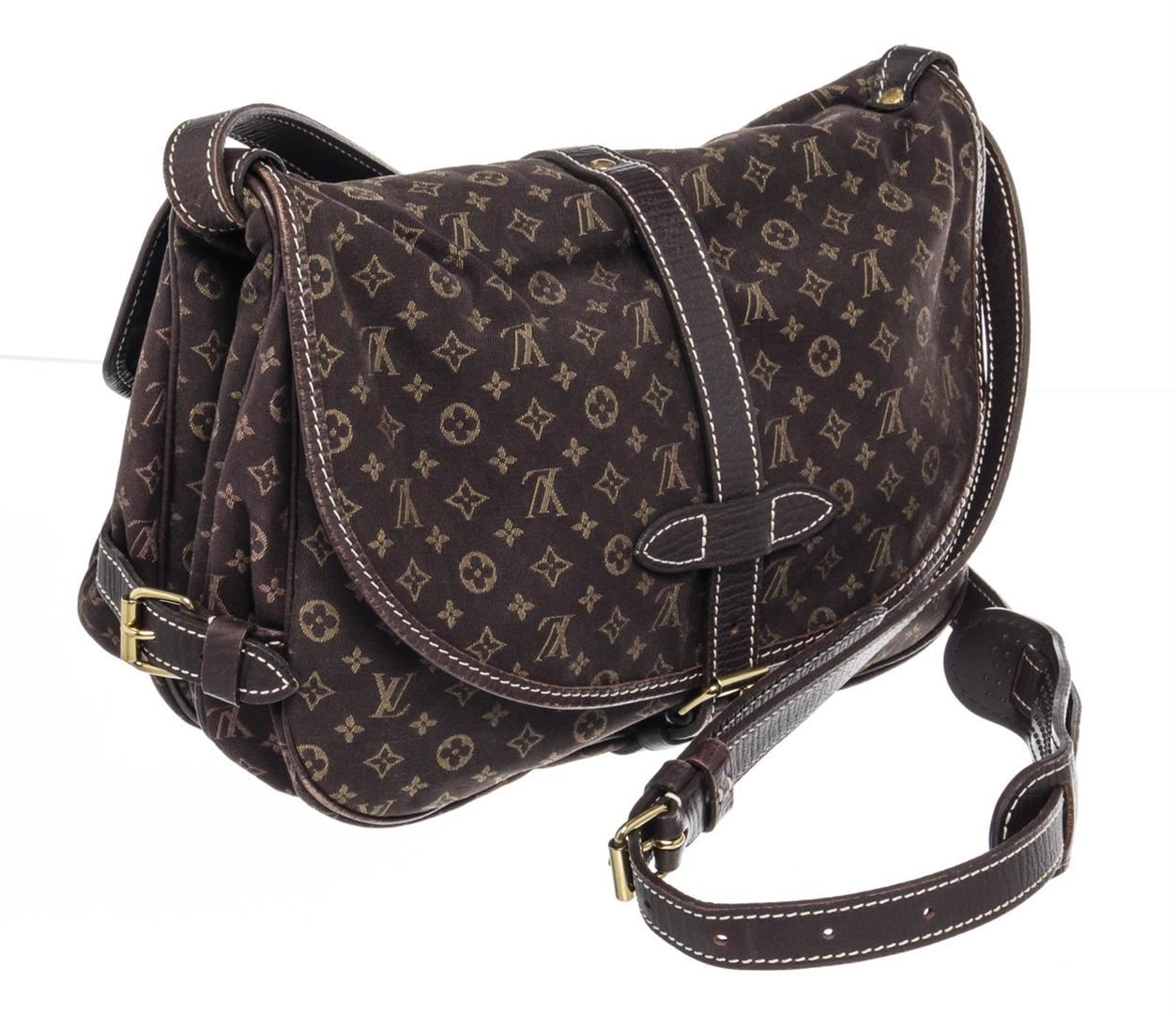 Louis Vuitton Brown Saumur 35cm Crossbody Bags with monogram canvas, gold ton hardware, tan vachetta leather trim, interior slip pockets, canvas lining, shoulder strap and trun-lock closures