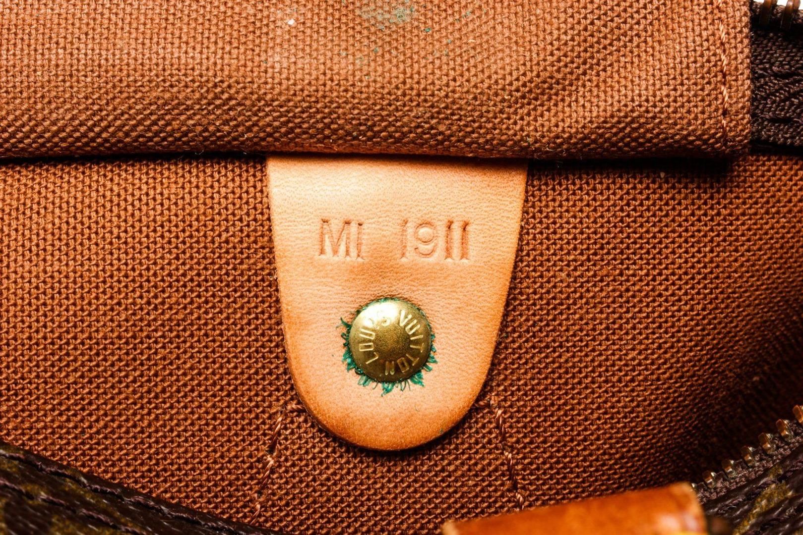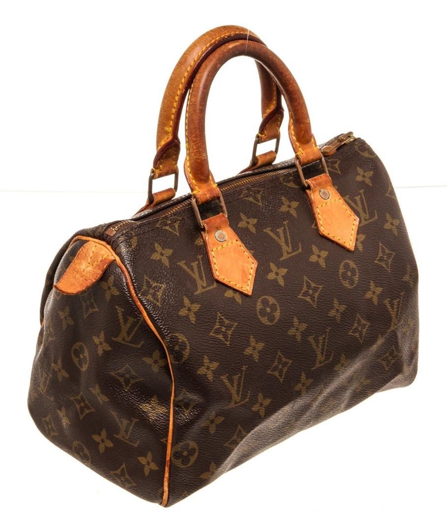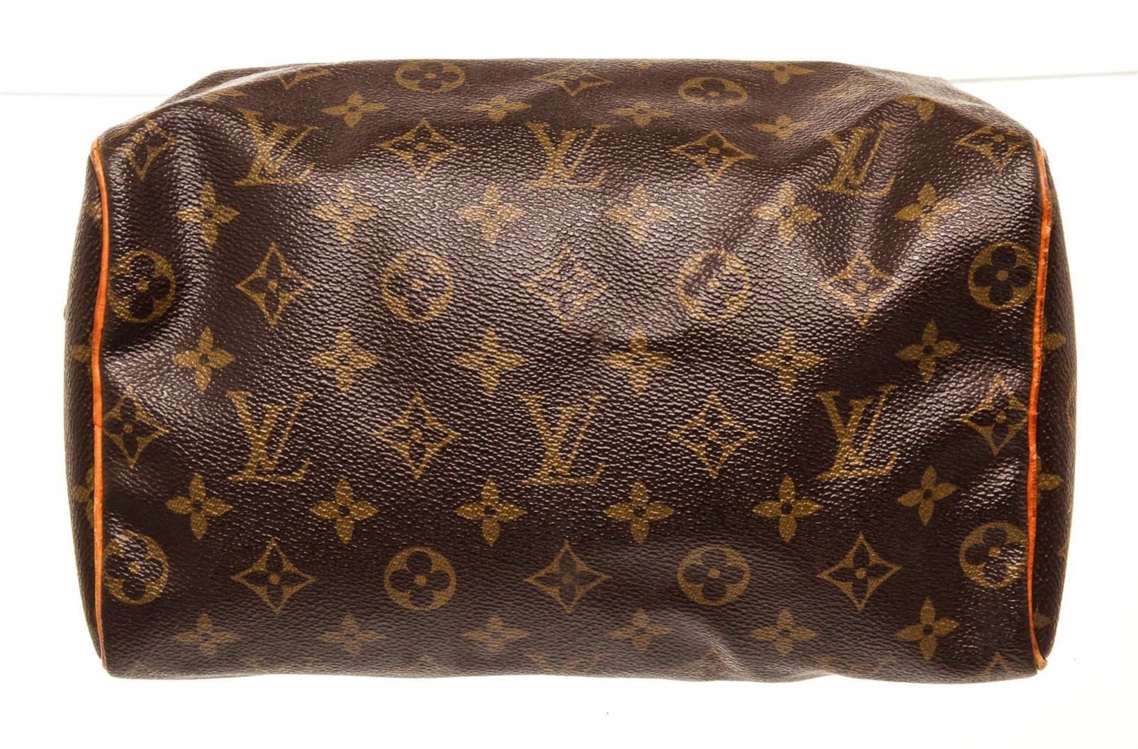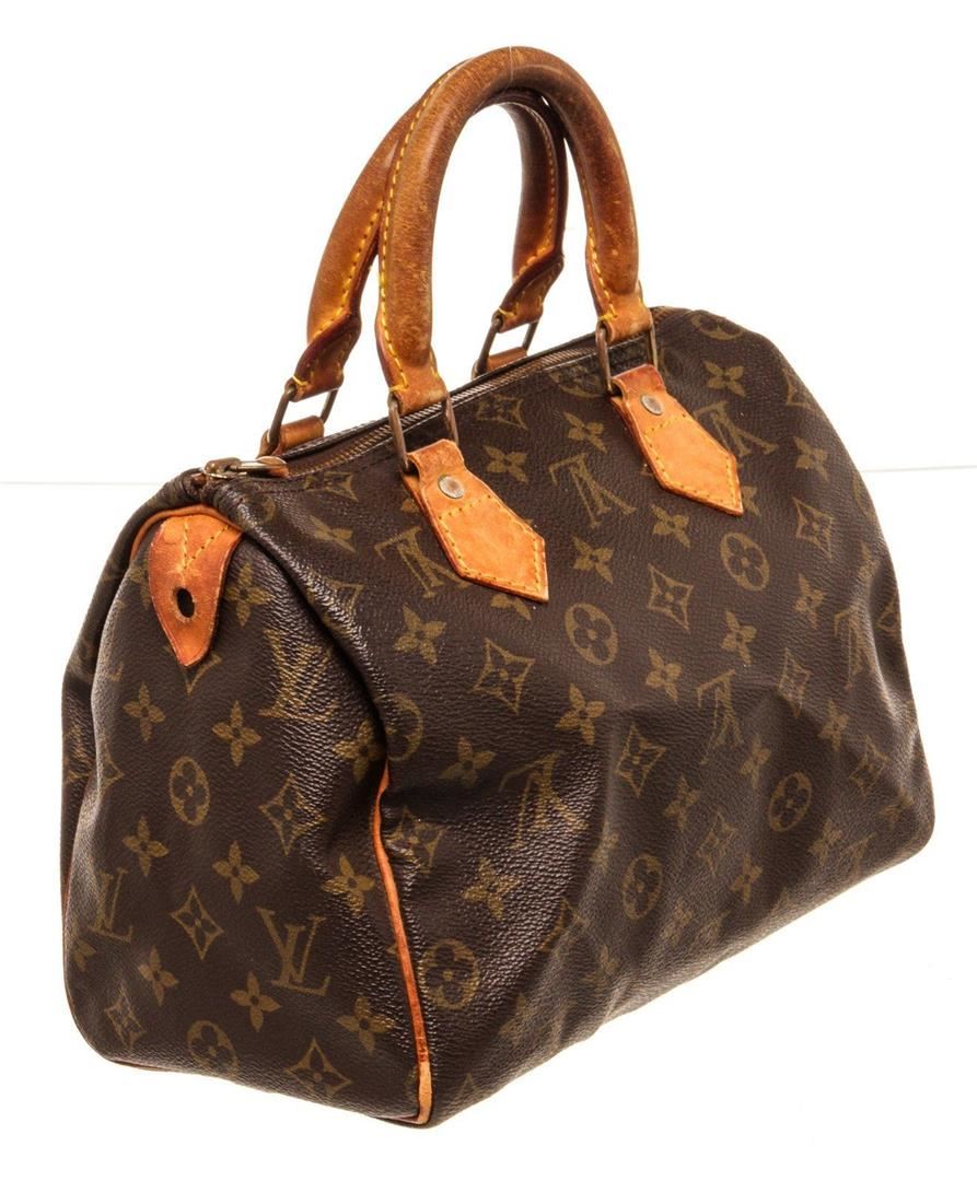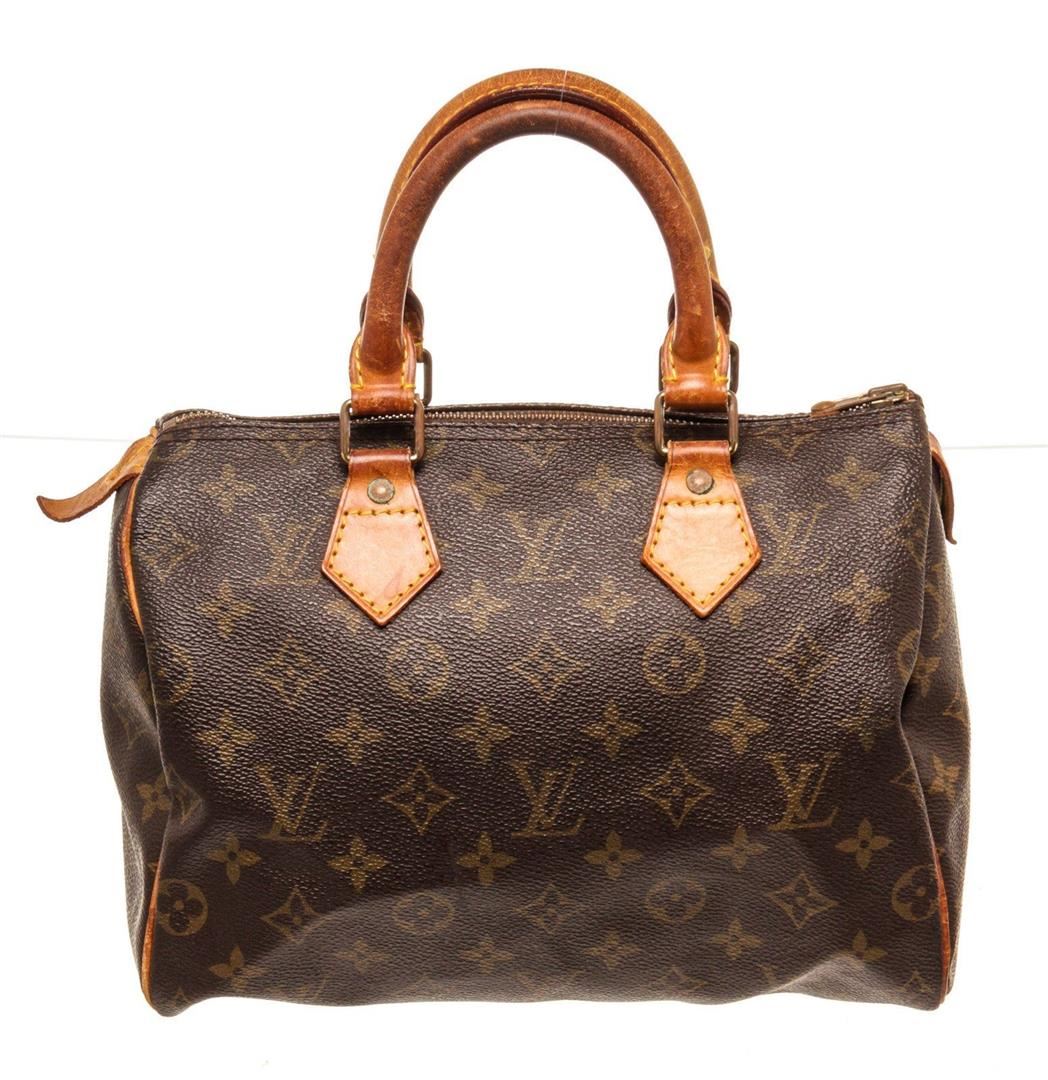 Louis Vuitton Brown Speedy 25cm Satchel Bag with monogram canvas, gold-tone hardware, trim tan vachetta leather, interior slip pocket , dual top handle and zipper closure.