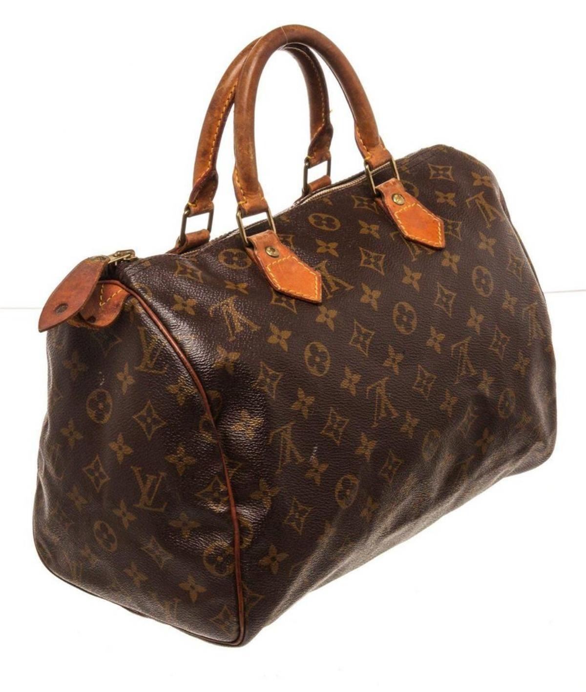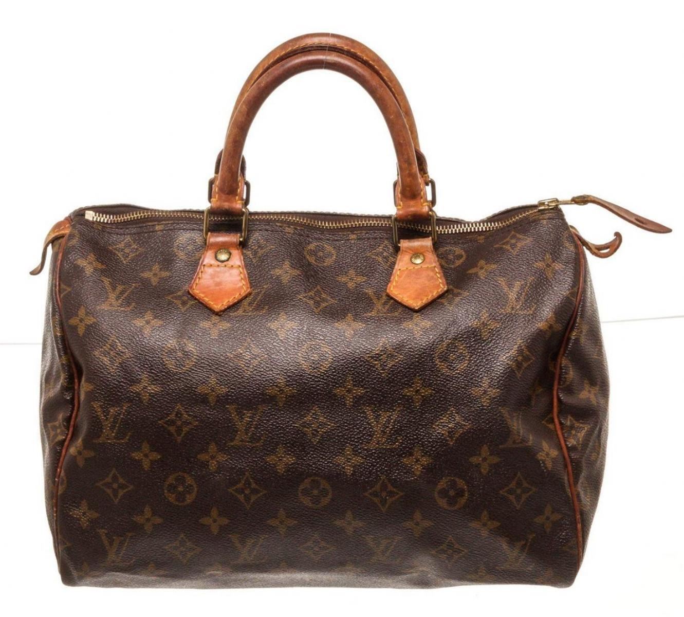 Louis Vuitton Brown Speedy 30cm Satchel Bag with material monogram canvas, gold-tone hardware, trim tan vachetta leather, dual top handle and zipper closure.