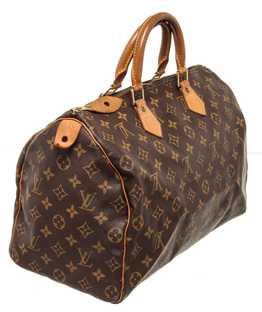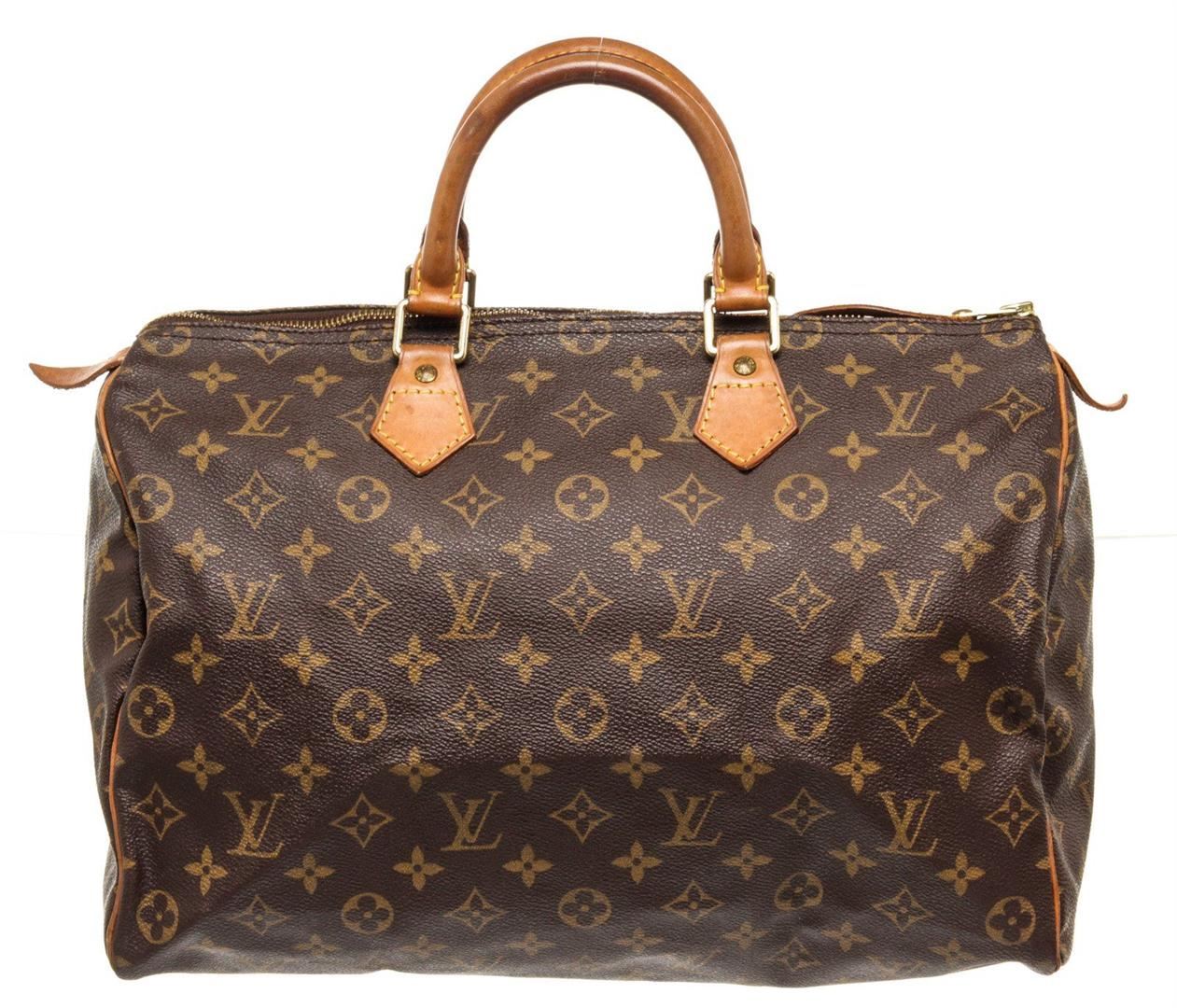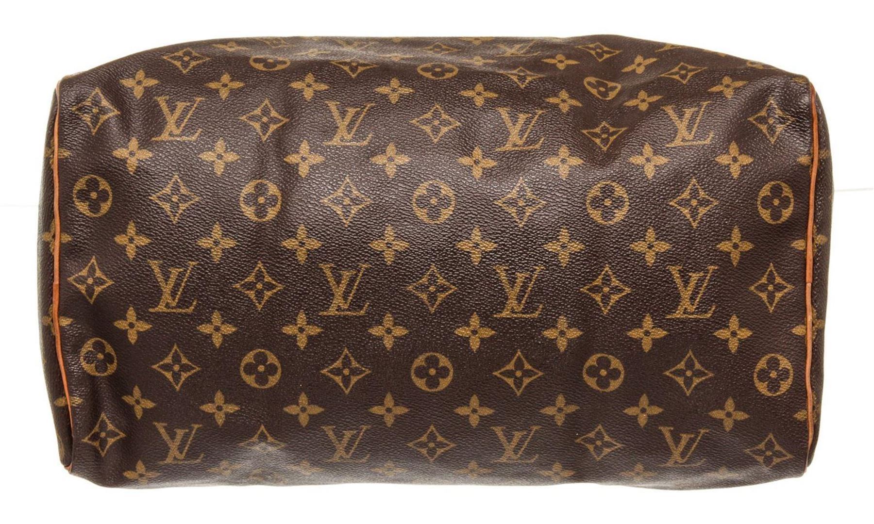 Louis Vuitton Brown Speedy 30cm Satchel Bag with monogram canvas, gold-tone hardware, trim tan vachetta leather, dual top handle and zipper closure.