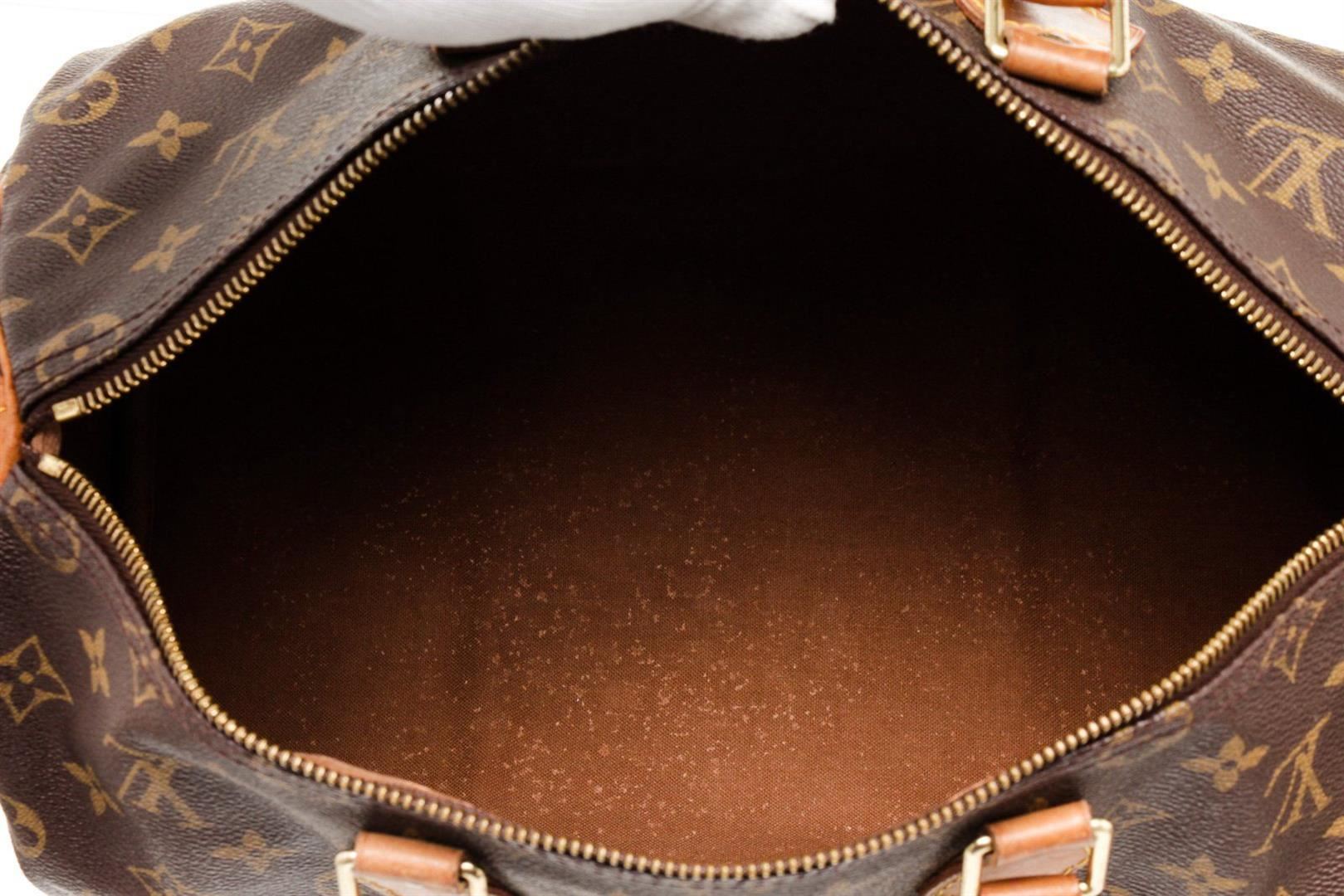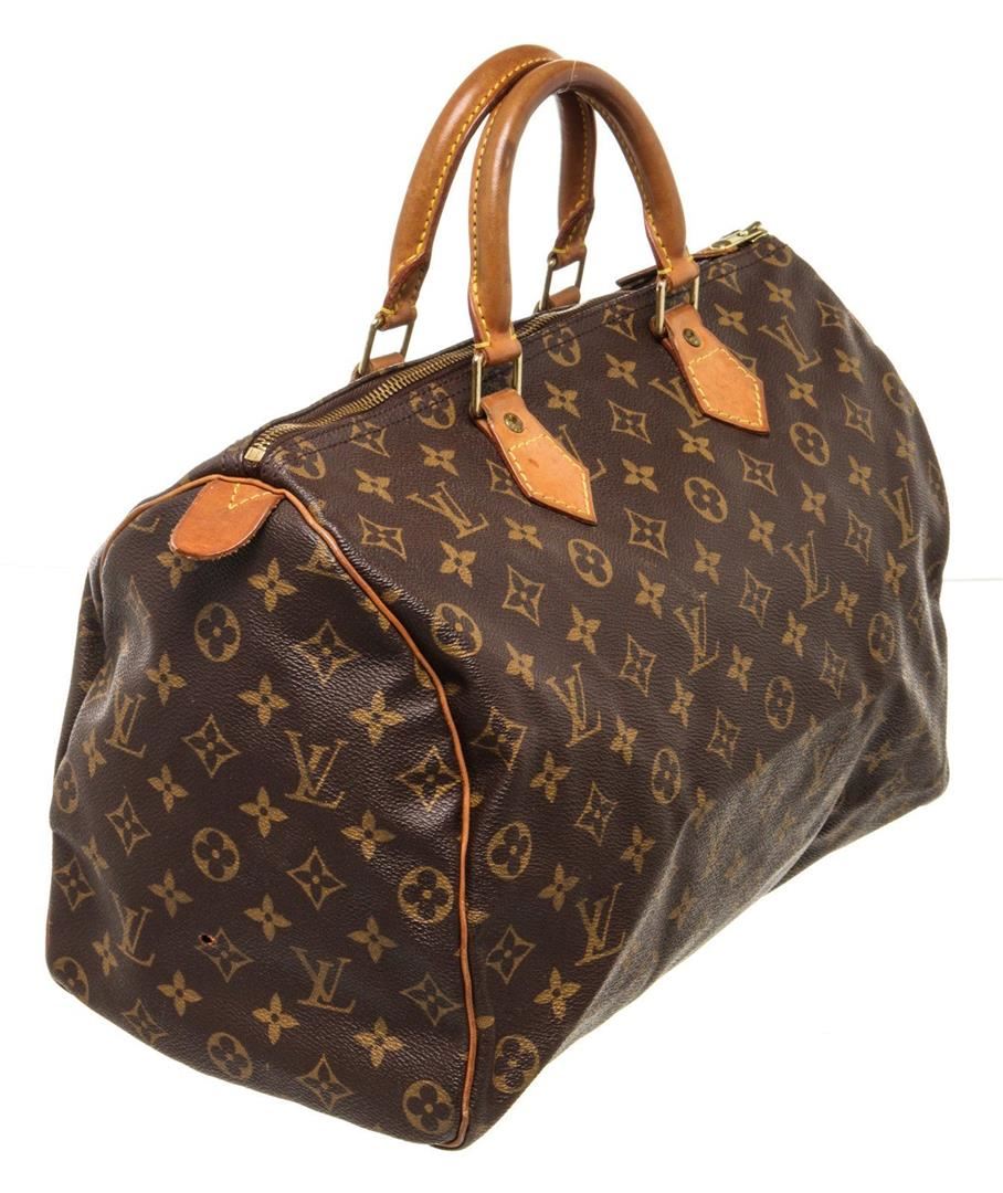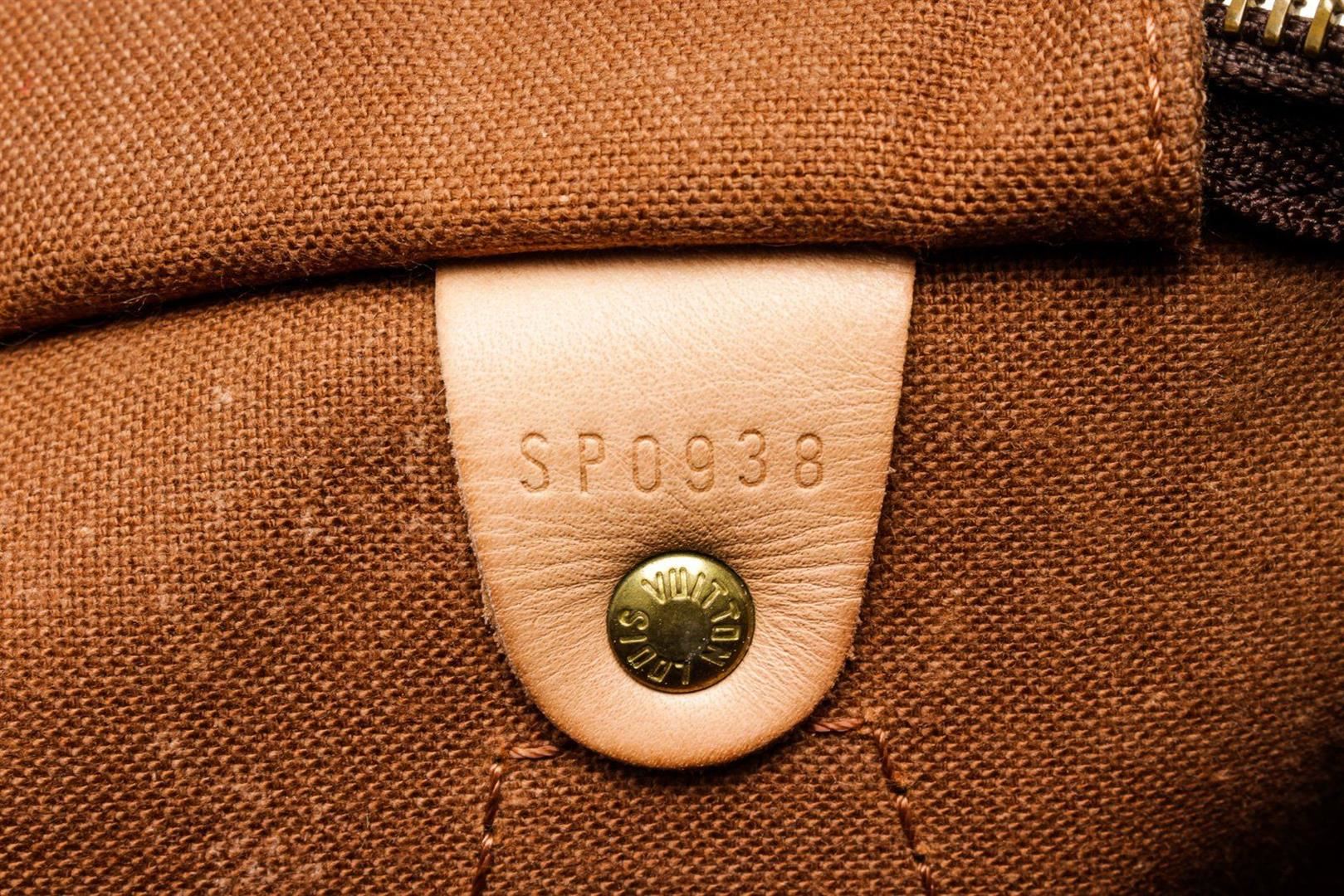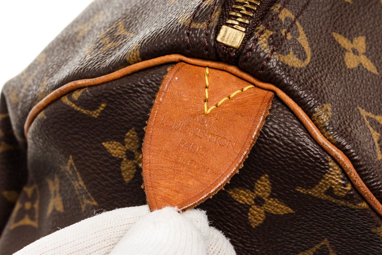 Louis Vuitton Brown Speedy 30cm Satchel Bag with monogram canvas, gold-tone hardware, trim tan vachetta leather, dual top handle and zipper closure.