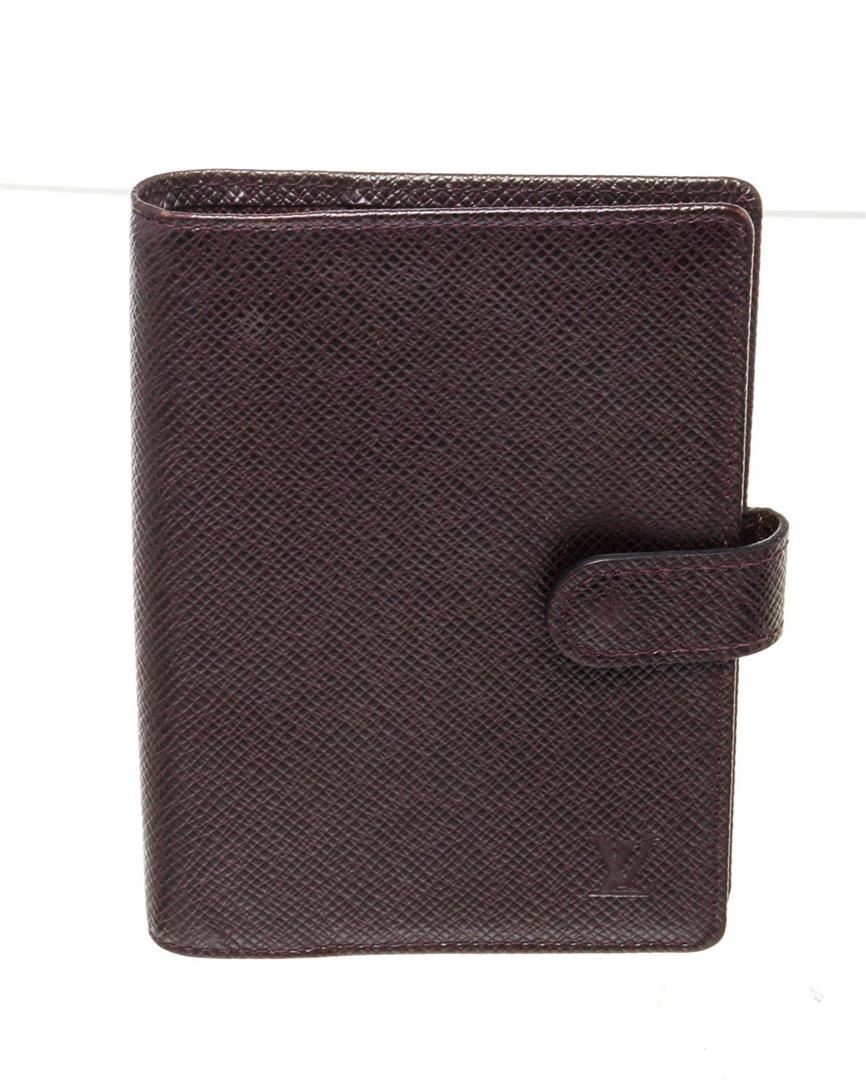 Louis Vuitton Brown Taiga Leather Agenda PM Wallet with taiga leather, silver-tone hardware, interior flap pockets, leather lining, snap closure.