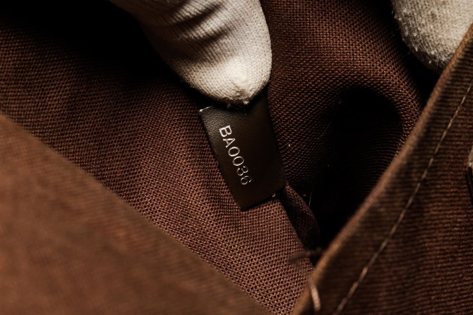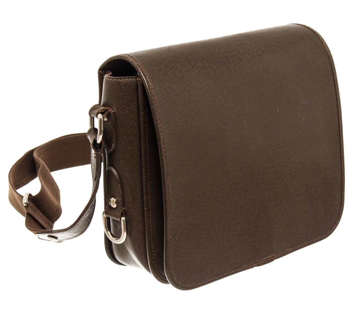 One Louis Vuitton Brown Taiga Leather Andrei Shoulder Bag. Item is sold AS-IS. All available information is listed in the description and shown in the photo. Louis Vuitton Brown Taiga Leather Andrei Shoulder Bag with silver tone hardware, brown leather trim, brown fabric lining, exterior back pocket, strap, and flap closure.