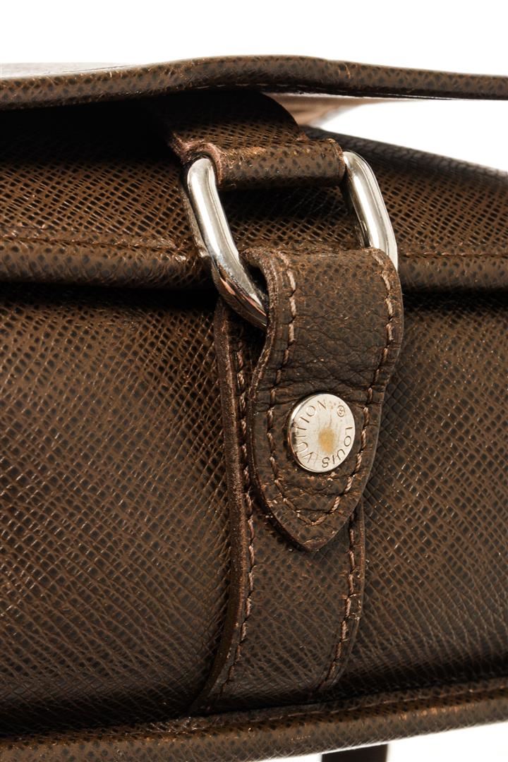 One Louis Vuitton Brown Taiga Leather Andrei Shoulder Bag. Item is sold AS-IS. All available information is listed in the description and shown in the photo. Louis Vuitton Brown Taiga Leather Andrei Shoulder Bag with silver tone hardware, brown leather trim, brown fabric lining, exterior back pocket, strap, and flap closure.