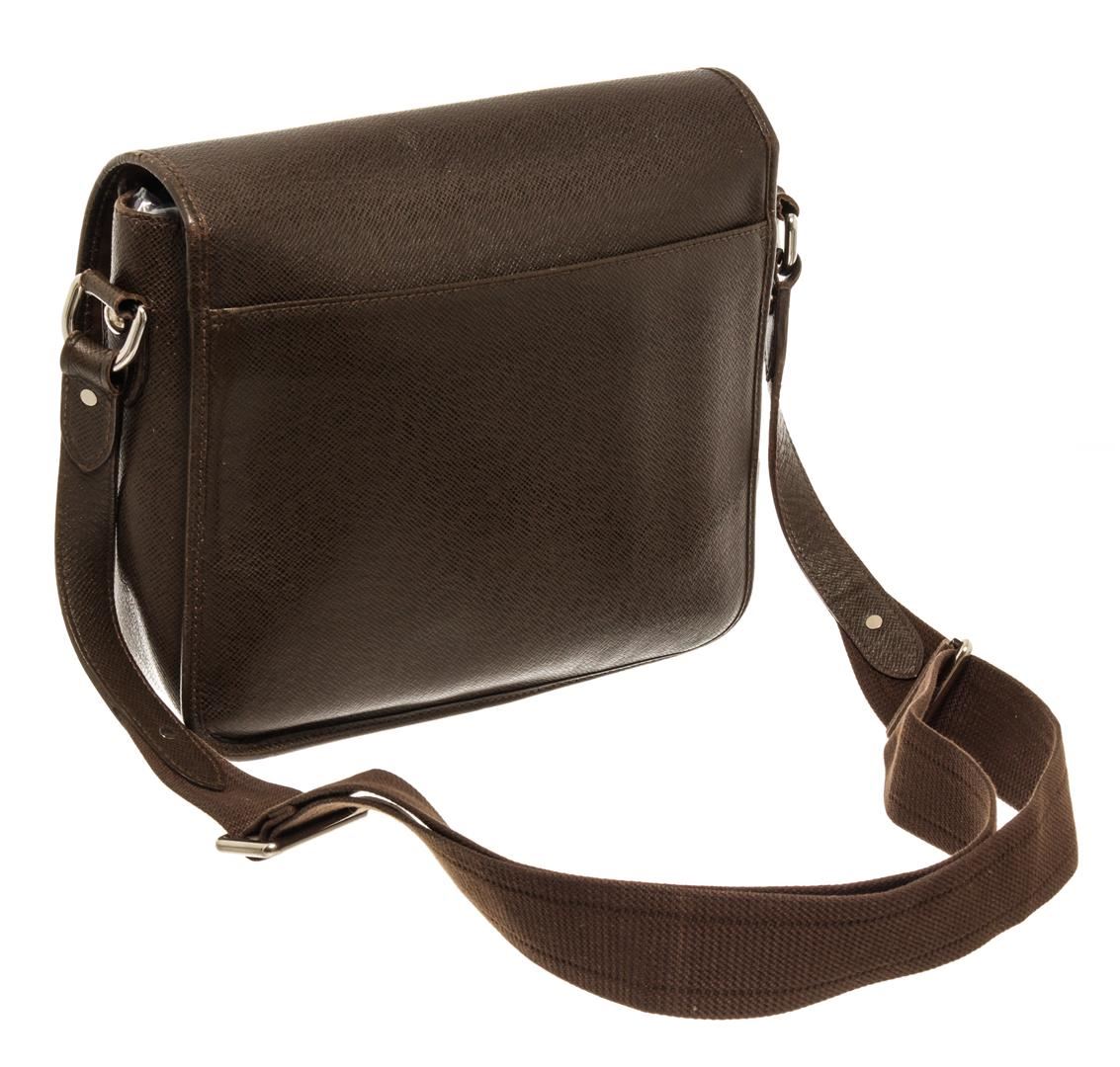 One Louis Vuitton Brown Taiga Leather Andrei Shoulder Bag. Item is sold AS-IS. All available information is listed in the description and shown in the photo. Louis Vuitton Brown Taiga Leather Andrei Shoulder Bag with silver tone hardware, brown leather trim, brown fabric lining, exterior back pocket, strap, and flap closure.