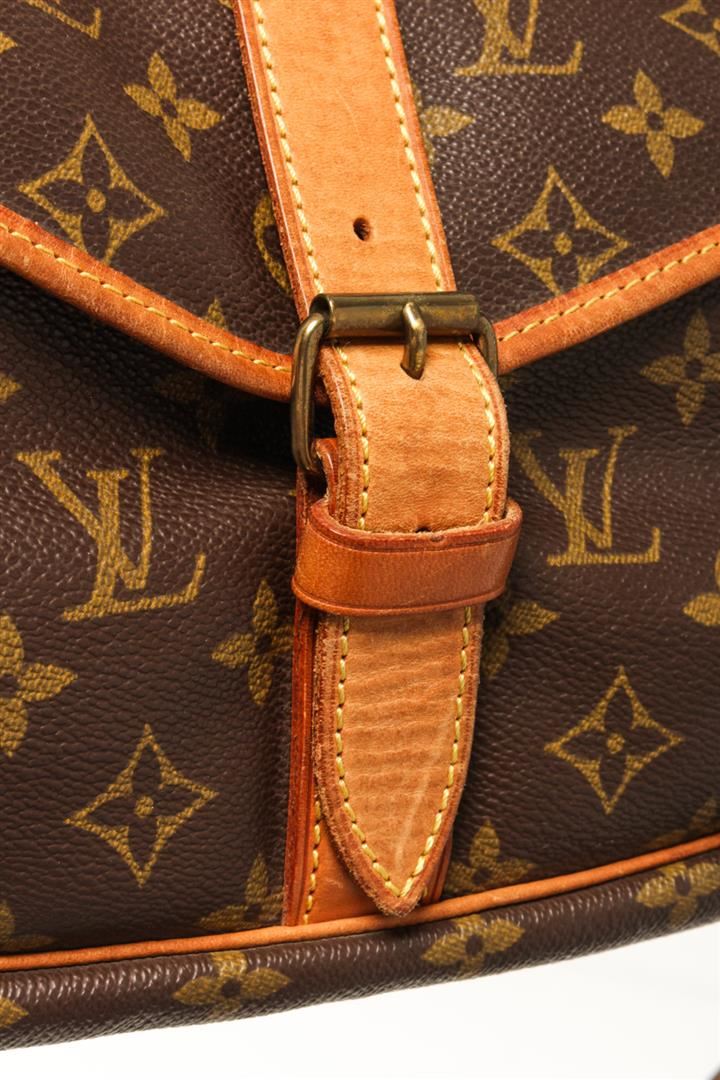 One Louis Vuitton Brown monogram Saumur 35 Crossbody Bag. Item is sold AS-IS. All available information is listed in the description and shown in the photo. louis vuitton brown monogram saumur 35 crossbody bag with features a monogram canvas exterior, brown fabric lining, a contrasting vachetta leather strap, front flaps with belt buckle closures, dual interior compartments, and interior slip pockets. Height: 10.6" Width: 9.4" Depth: 8.7, Handle Drop: / 26.93 x 23.88 x 22.1 Cm
