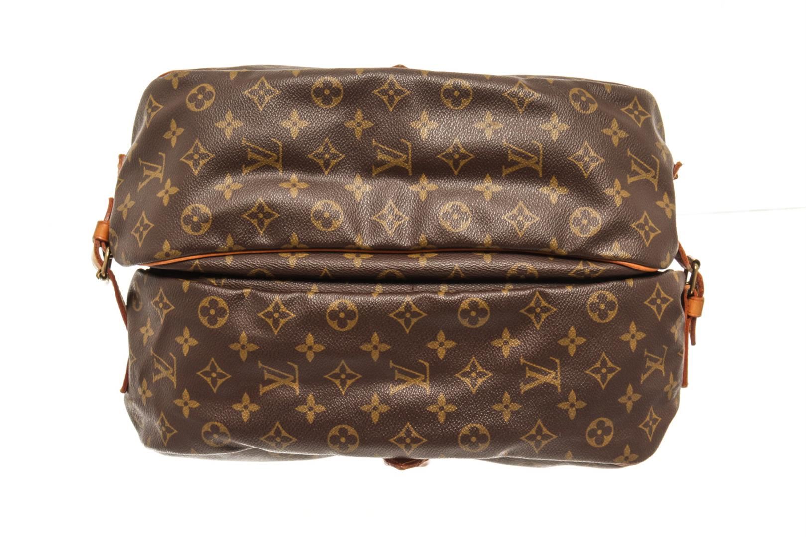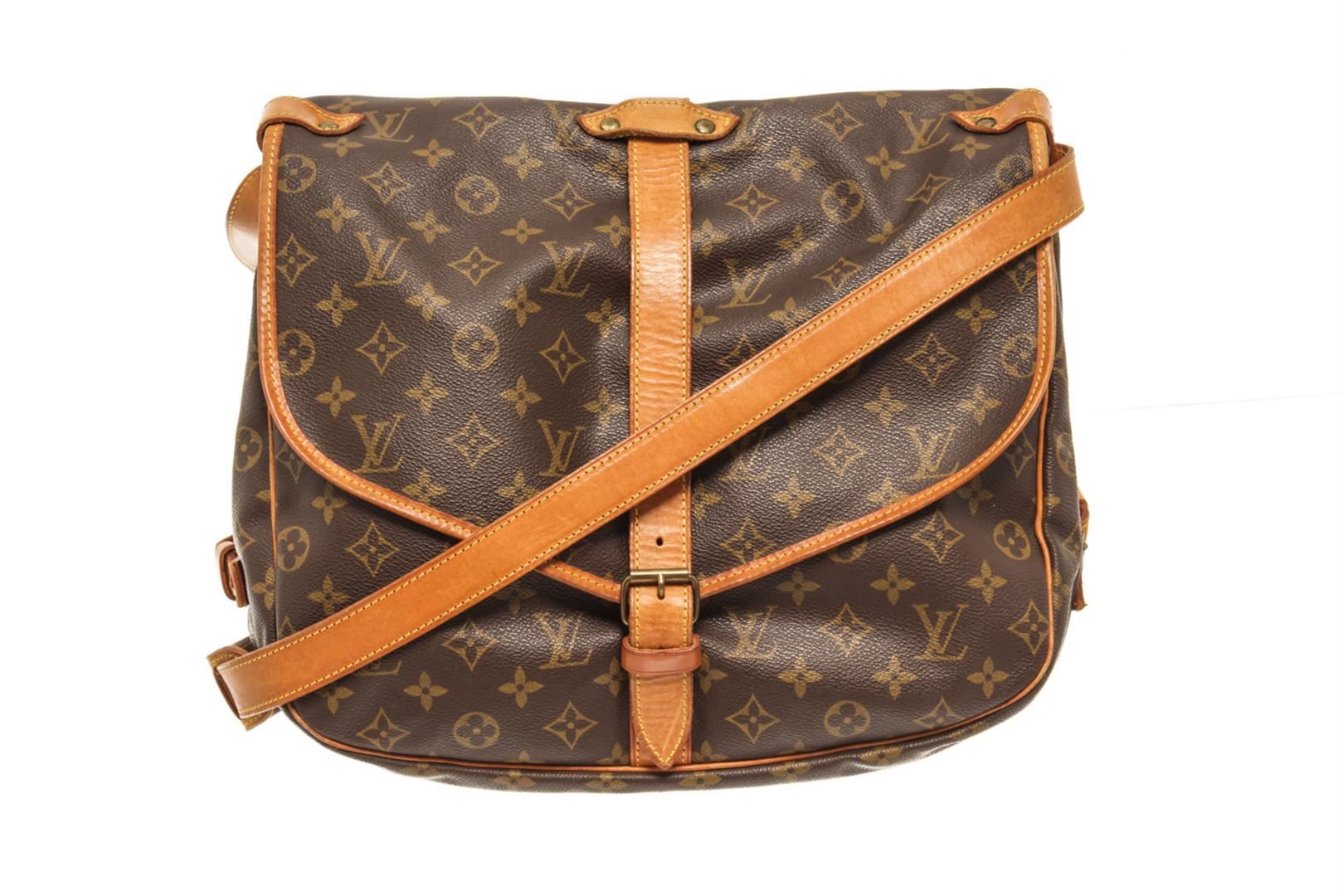 One Louis Vuitton Brown monogram Saumur 35 Crossbody Bag. Item is sold AS-IS. All available information is listed in the description and shown in the photo. louis vuitton brown monogram saumur 35 crossbody bag with features a monogram canvas exterior, brown fabric lining, a contrasting vachetta leather strap, front flaps with belt buckle closures, dual interior compartments, and interior slip pockets. Height: 10.6" Width: 9.4" Depth: 8.7, Handle Drop: / 26.93 x 23.88 x 22.1 Cm