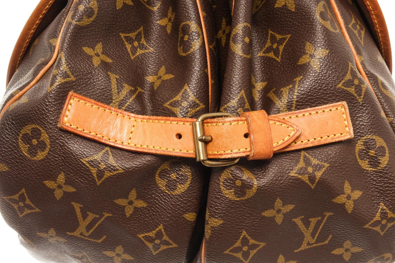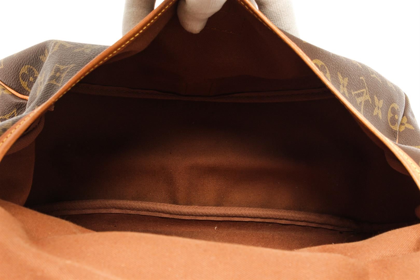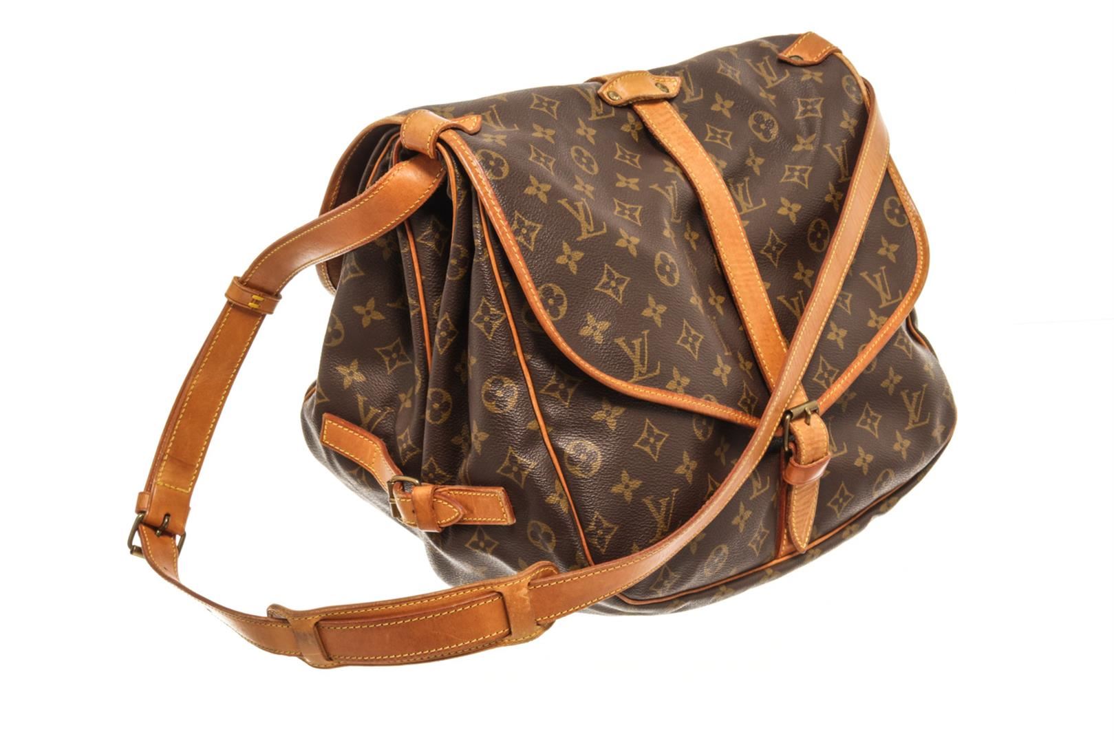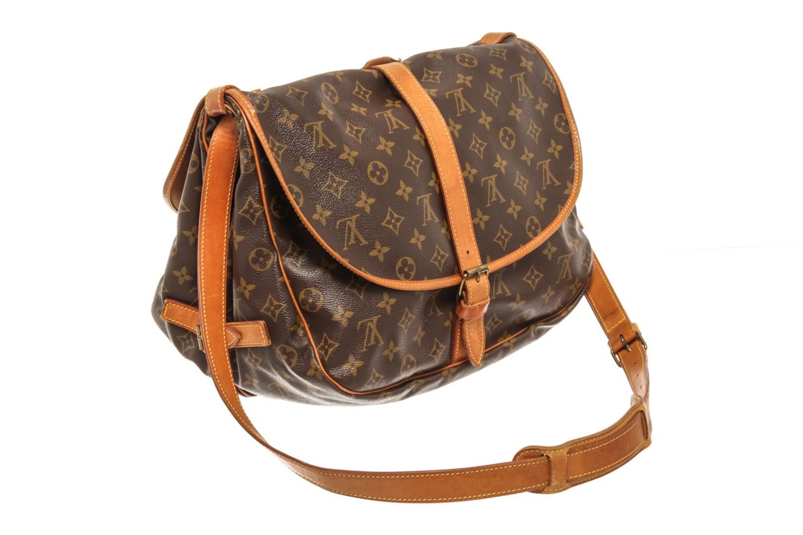 One Louis Vuitton Brown monogram Saumur 35 Crossbody Bag. Item is sold AS-IS. All available information is listed in the description and shown in the photo. louis vuitton brown monogram saumur 35 crossbody bag with features a monogram canvas exterior, brown fabric lining, a contrasting vachetta leather strap, front flaps with belt buckle closures, dual interior compartments, and interior slip pockets. Height: 10.6" Width: 9.4" Depth: 8.7, Handle Drop: / 26.93 x 23.88 x 22.1 Cm