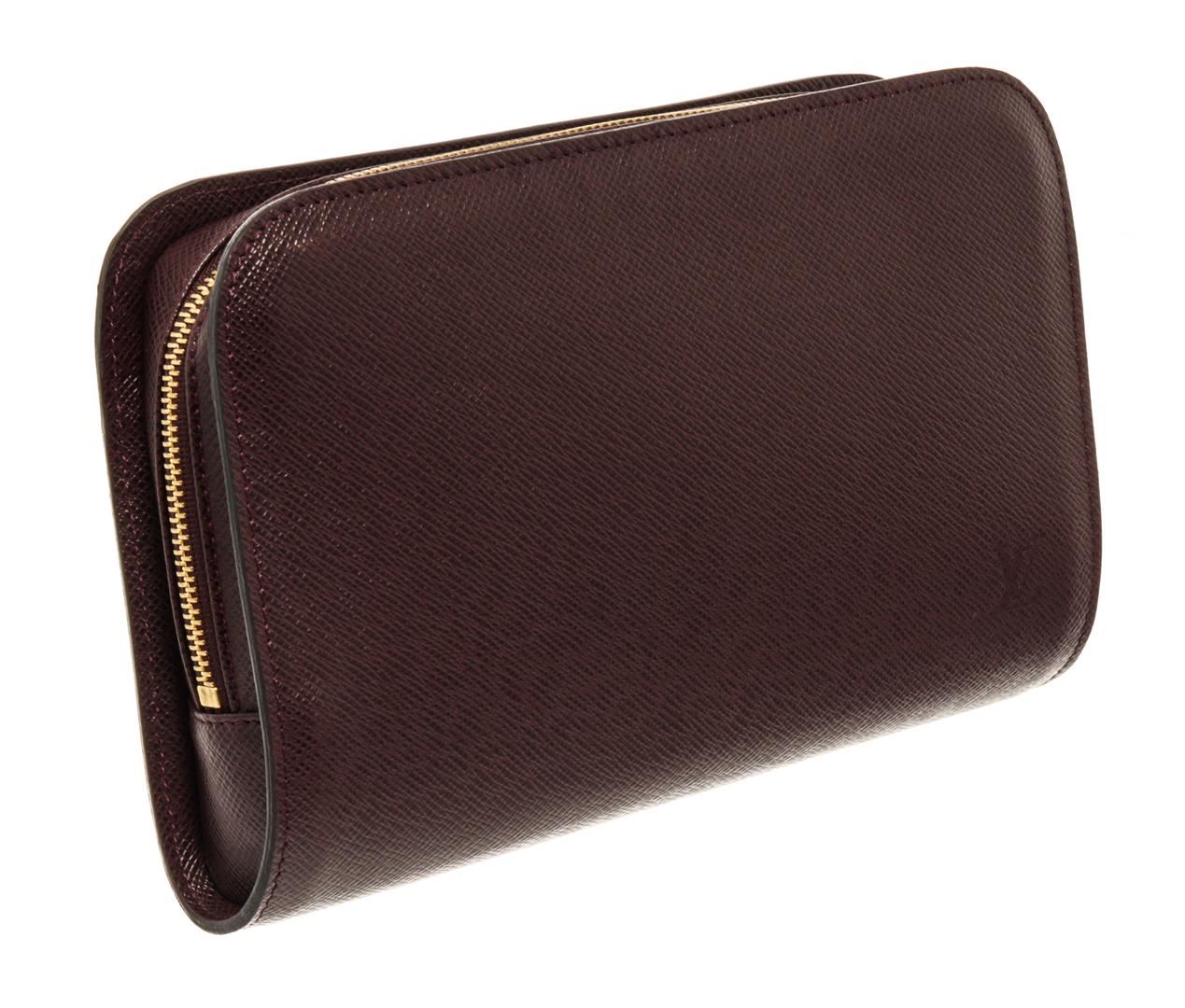 One Louis Vuitton Burgundy Taiga Leather Baikal Clutch. Item is sold AS-IS. All available information is listed in the description and shown in the photo. Louis Vuitton Red Leather Baikal Clutch with leather, gold-tone hardware, red leather trim, red taiga leather lining, three interior compartments pockets and a zipper closure.