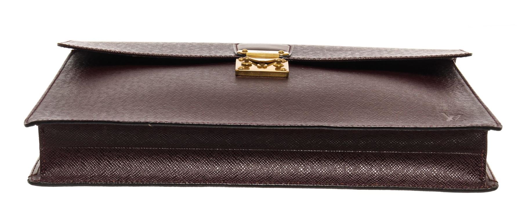 One Louis Vuitton Burgundy Taiga Leather Serviette Clado Briefcase. Item is sold AS-IS. All available information is listed in the description and shown in the photo. Louis Vuitton Burgundy Taiga Leather Serviette Clado Briefcase with gold tone hardware, burgundy leather trim, burgundy suede lining, exterior open pocket, and buckle closure.