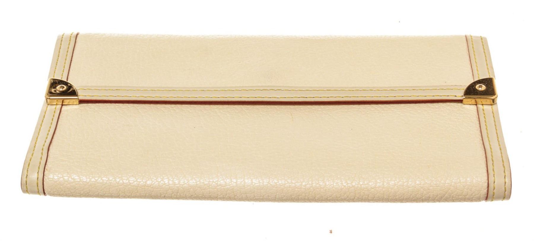 One Louis Vuitton Cream Leather International Wallet. Item is sold AS-IS. All available information is listed in the description and shown in the photo. Louis Vuitton Cream Leather International Wallet with leather, gold-tone hardware, trim tan vachetta leather, interior three compartments pocket and snap closure.
